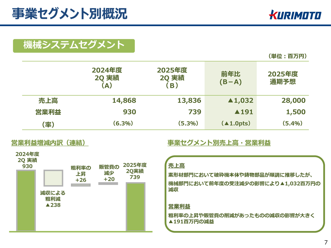 機械システムセグメントについてですが、売上高は素形材部門で破砕機本体や鋳物部品が順調に推移したものの、機械部門における前年度の受注減少の影響を受け、前年比10億3,200万円減収の138億3,600万円となりました。
