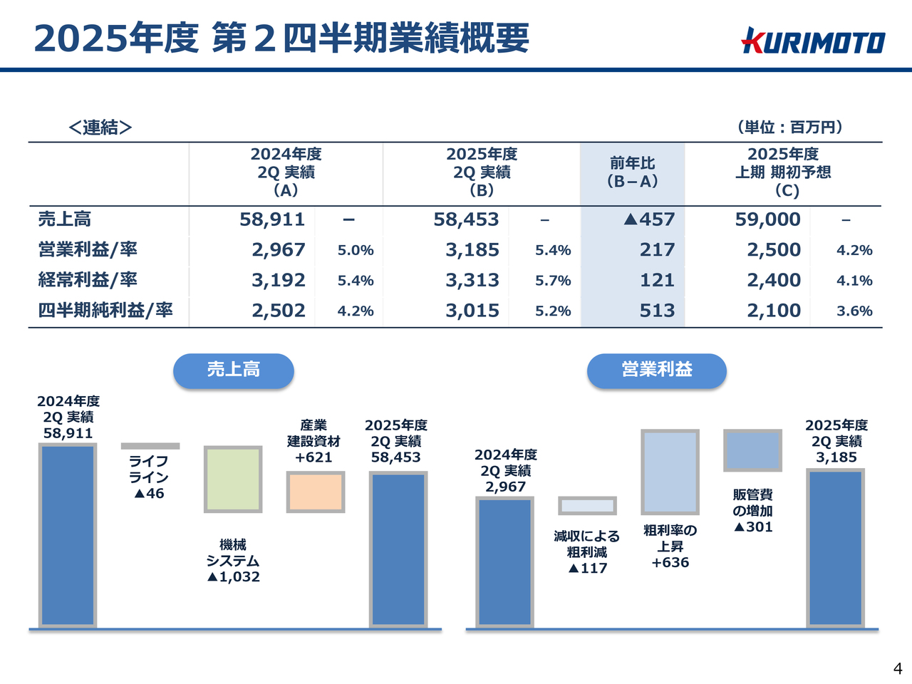 結果として、2025年度第2四半期の実績は、前年同期比で売上高が4億5,700万円減収の584億5,300万円、営業利益が2億1,700万円増益の31億8,500万円、経常利益が1億2,100万円増益の33億1,300万円、四半期純利益が5億1,300万円増益の30億1,500万円となりました。