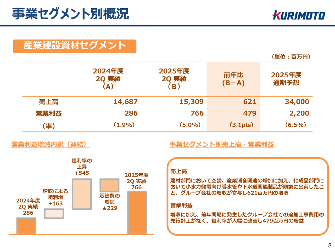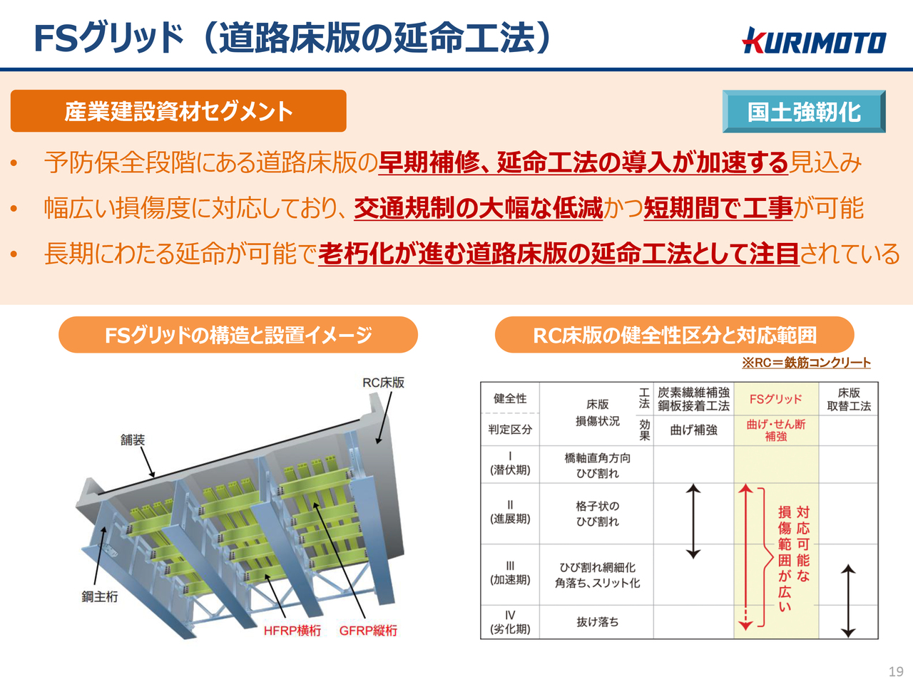 産業建設資材セグメントは、インフラ更新需要の取り込みによる増収を見込む一方で、前期に建材部門のグループ会社で発生した追加工事による特別利益計上案件などがないため、減益となる見込みです。