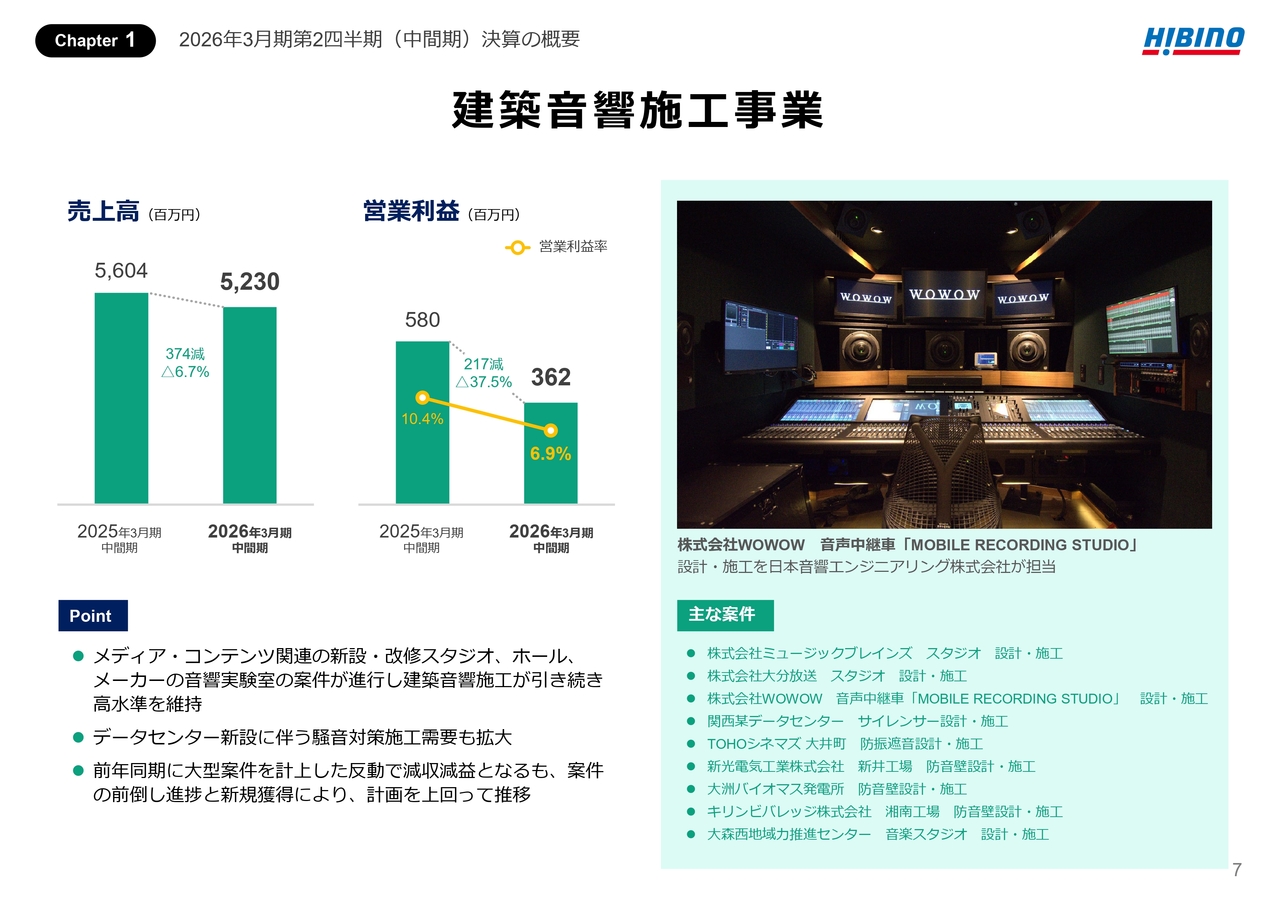 「建築音響施工事業」は、建築音響(音空間)に関する設計・施工を行っており、売上高構成は16.7パーセント(前年同期は20.8パーセント、前年同期比マイナス4.1パーセント)です。