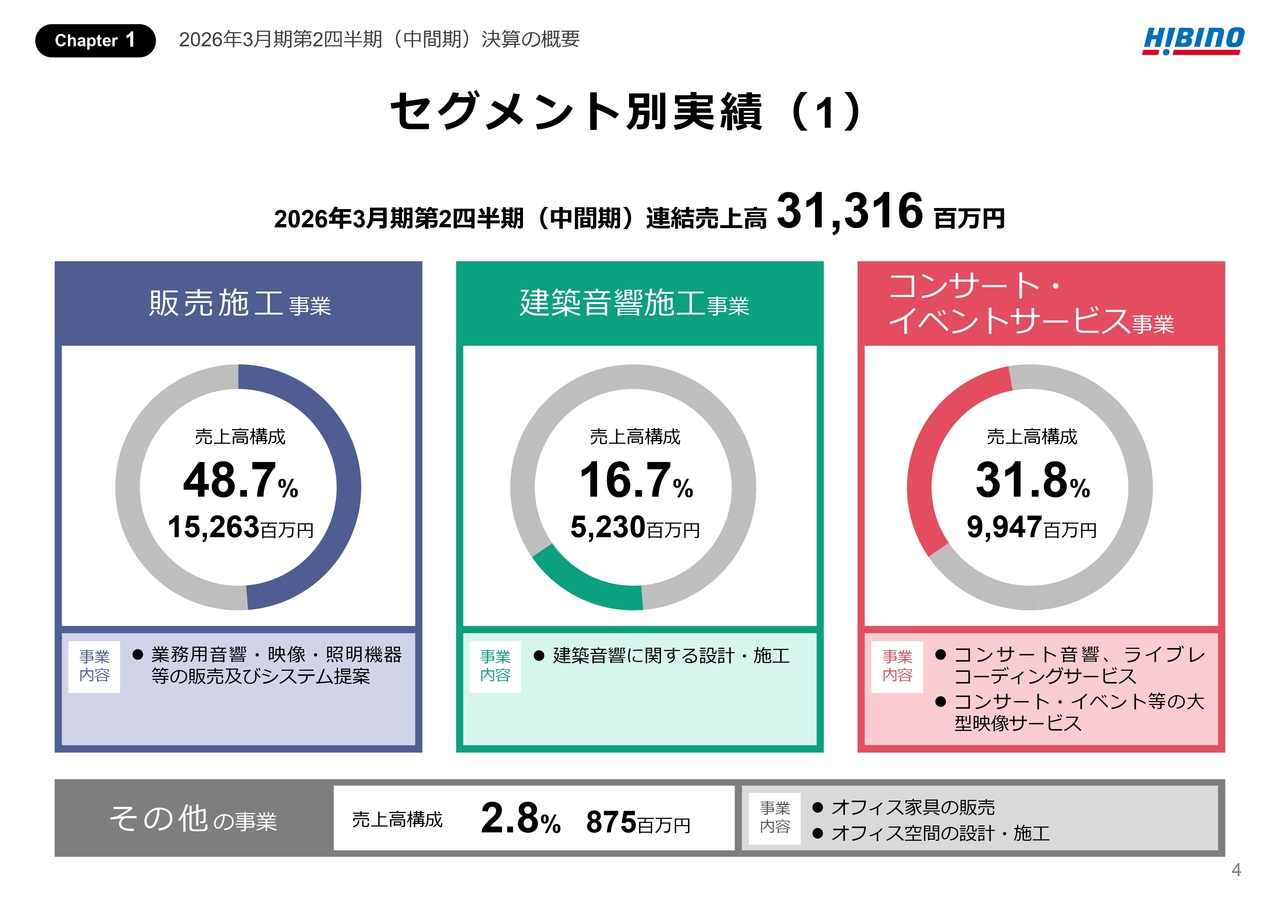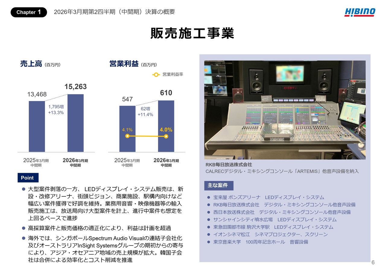 「販売施工事業」は、業務用音響・映像・照明機器等の販売及びシステム提案を行っており、売上高構成は48.7パーセント(前年同期は50.1パーセント、前年同期比マイナス1.4パーセント)です。