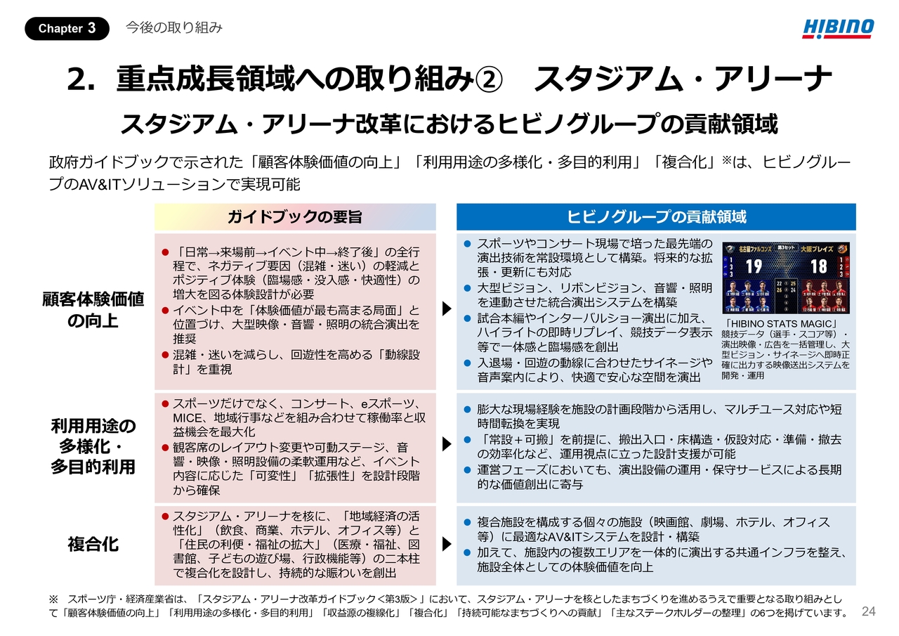 国のガイドブックが示す方向性と当社グループの強みが一致しており、スタジアム・アリーナ改革に大きく貢献できると考えています。