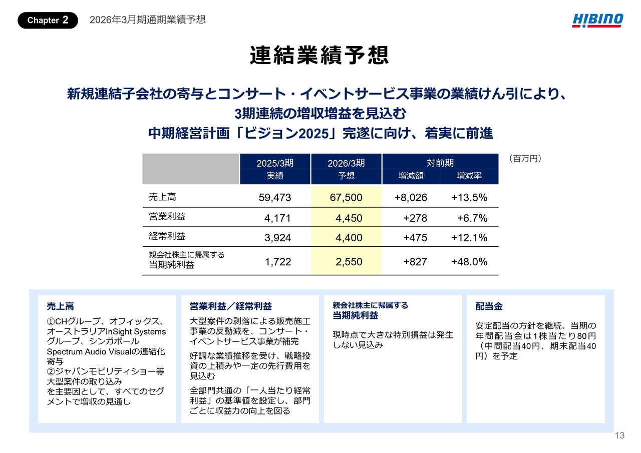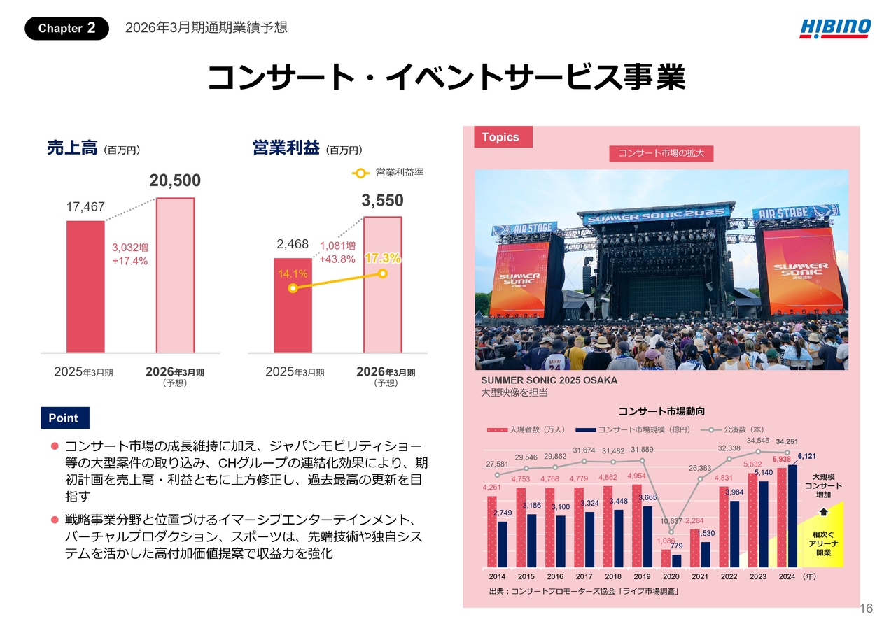 こうしたコンサート市場の成長が続く中、ジャパンモビリティショーなどの大型案件の取り込みに加え、CHグループの連結効果が寄与する見通しです。
