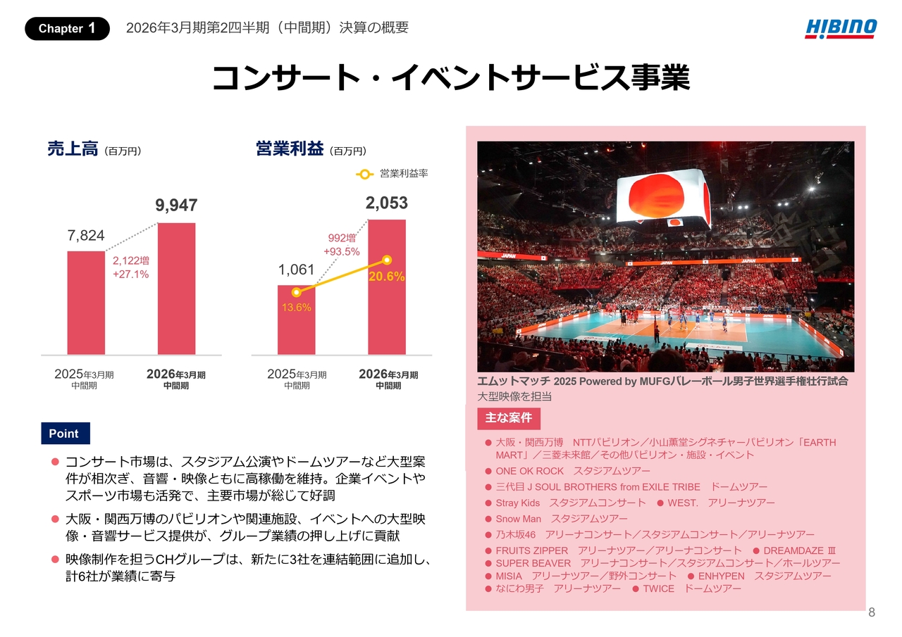 加えて、コンサート・イベントサービス事業が、大阪・関西万博の開催や、活況が続くコンサート市場の需要を的確に捉え、増収に貢献しました。