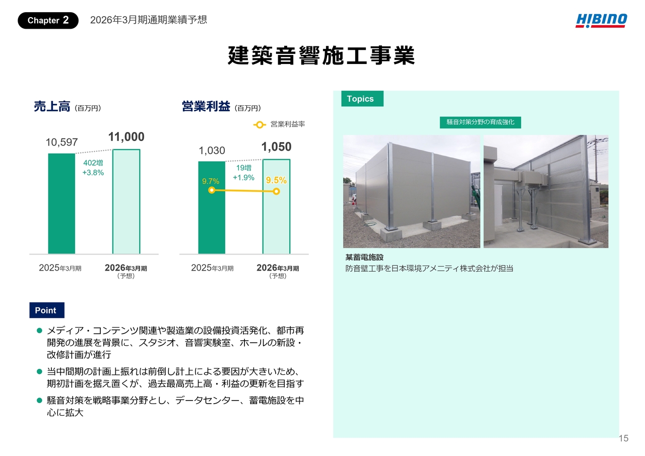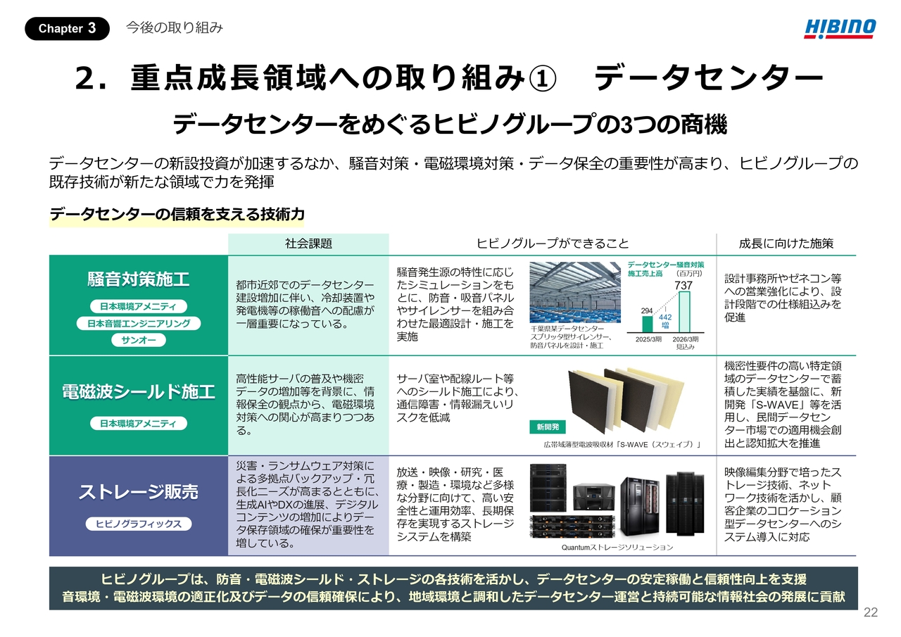 また、戦略事業分野と位置づける騒音対策については、近年、データセンターや蓄電施設の建設が相次いでおり、これらの施設における需要が今後伸びていくと予想しています。