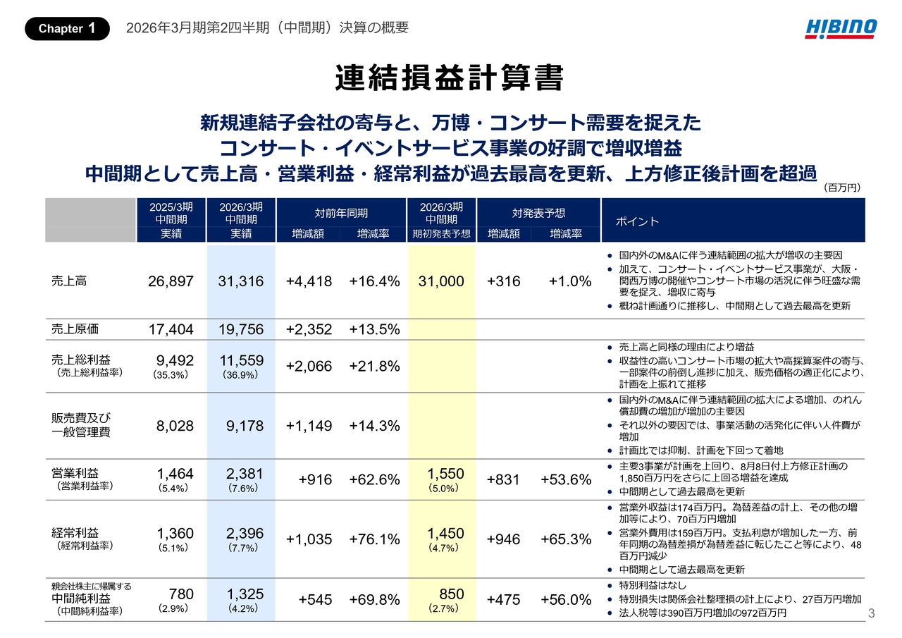 ヒビノ、3期連続増配を予定 売上高・営業利益・経常利益が中間期過去最高、コンサート・イベントサービス事業が業績を牽引