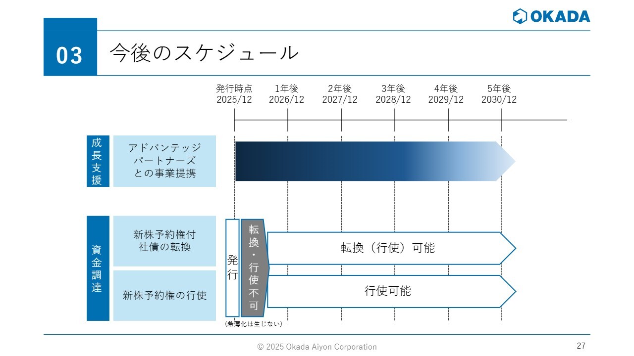 転換は半年後から可能ですが、従来のAP社の動向を踏まえると、事業提携の効果が十分に現れ株価が上昇してから出口と想定しています。そのため、事業提携は少なくとも3年間継続することを見込んでいます。