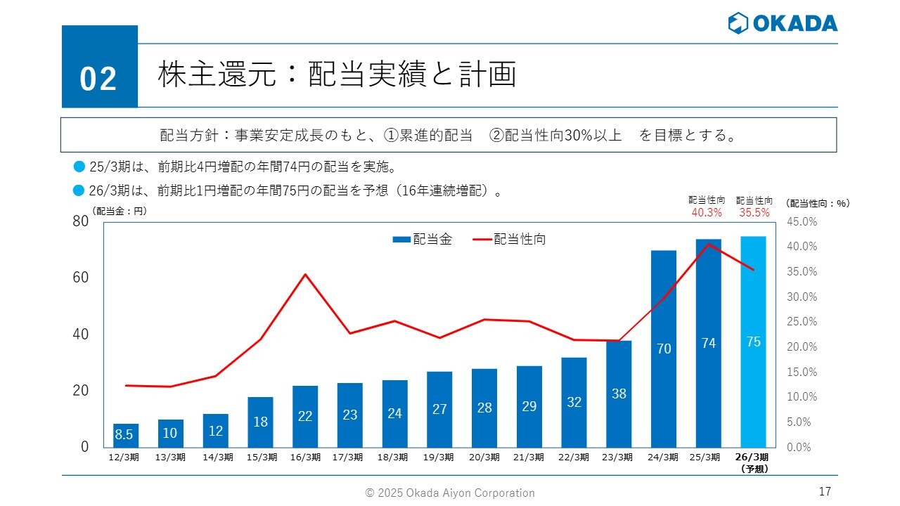 2025年3月期の配当金は、前期比で4円増配し、年間74円の配当を実施しました。さらに、2026年3月期の配当金は、前期比で1円増配し、年間75円の配当を予定しています。この場合、16年連続の増配となります。