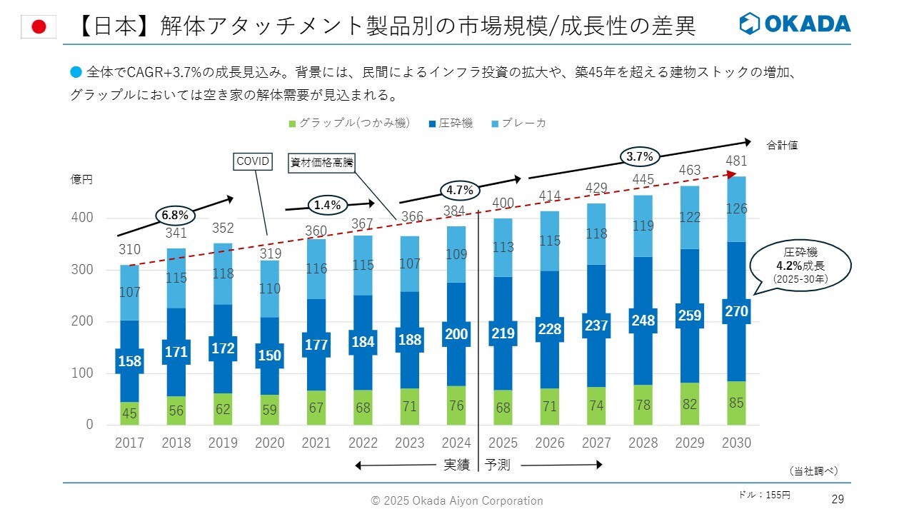 【日本】解体アタッチメント製品別の市場規模/成長性の差異