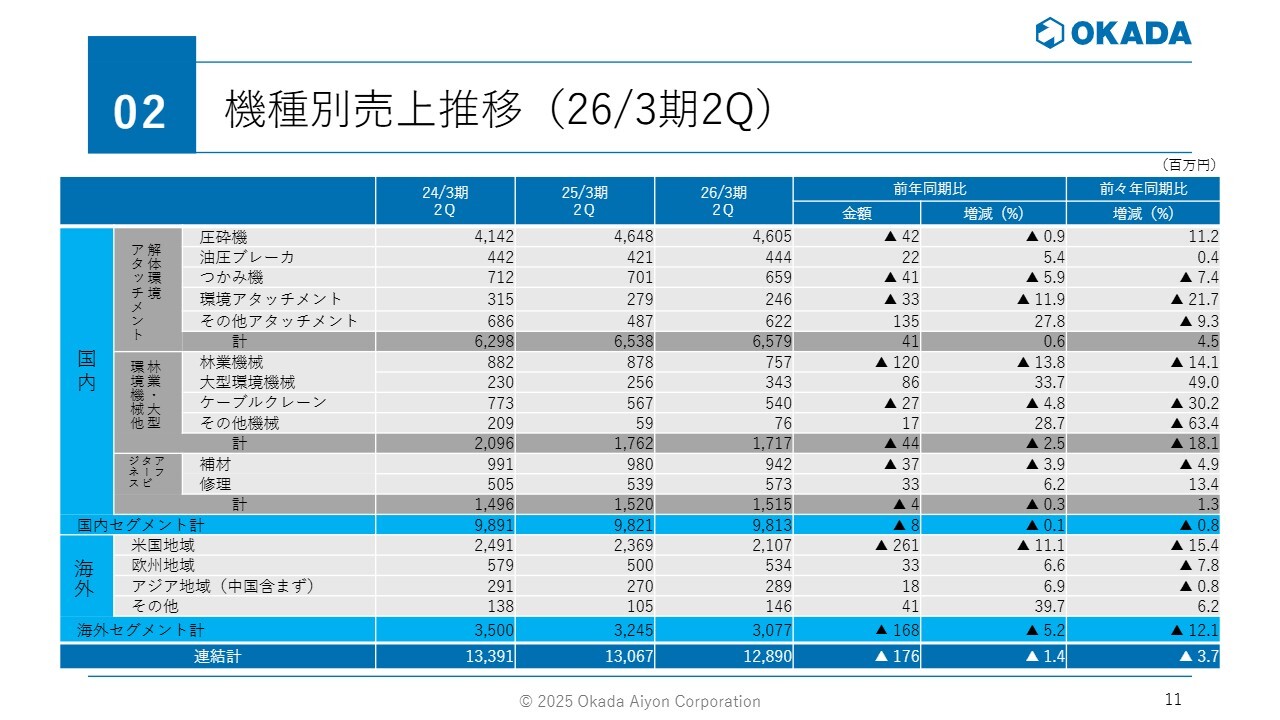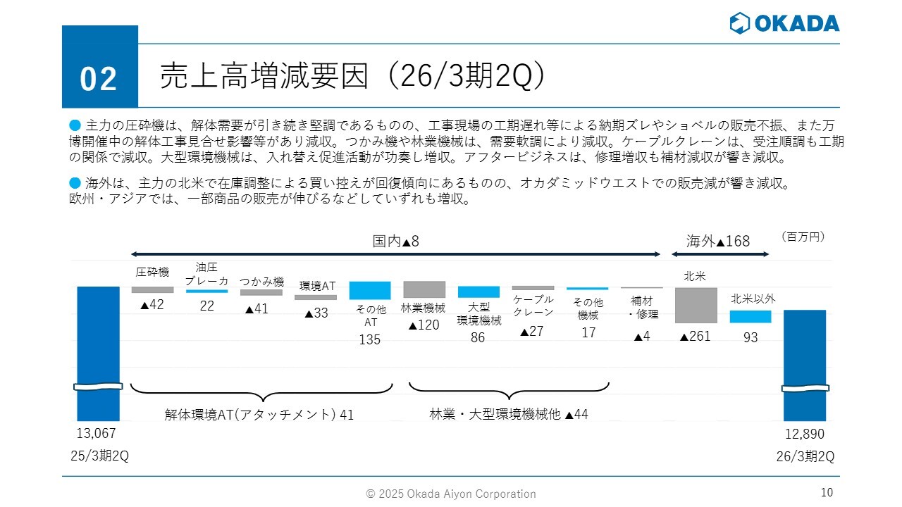 2026年3月期第2四半期の売上高増減要因についてです。国内セグメントでは、主力である圧砕機の解体需要が引き続き堅調である一方で、工事現場の工期遅れによる納期ずれやショベルの販売不振、さらに万博開催中の解体工事の見合わせの影響などがあり、減収となりました。