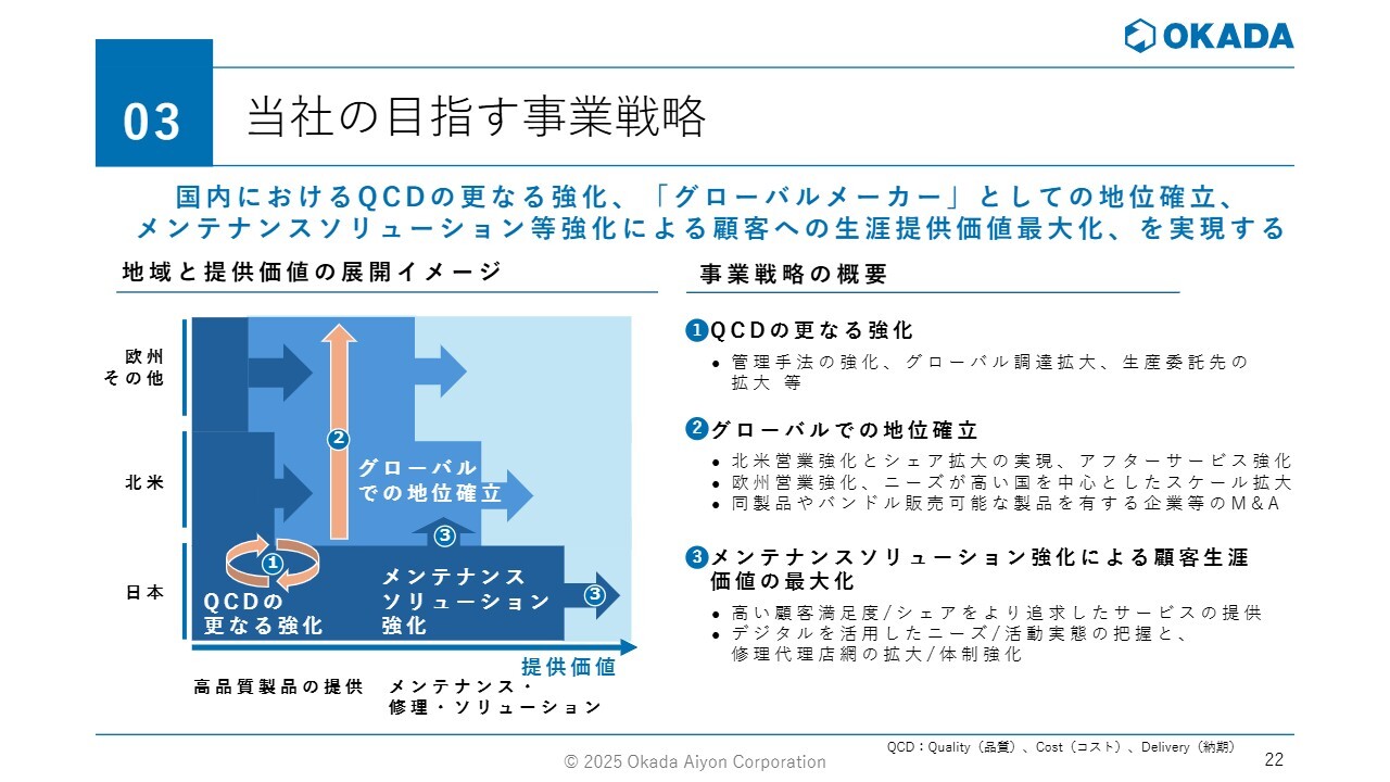 提携では、全社QCDのさらなる強化、北米や欧州などへのグローバル化、メンテナンス・修理等強化によるソリューション提供を当社が取り組むべき事業戦略方針として定めています。