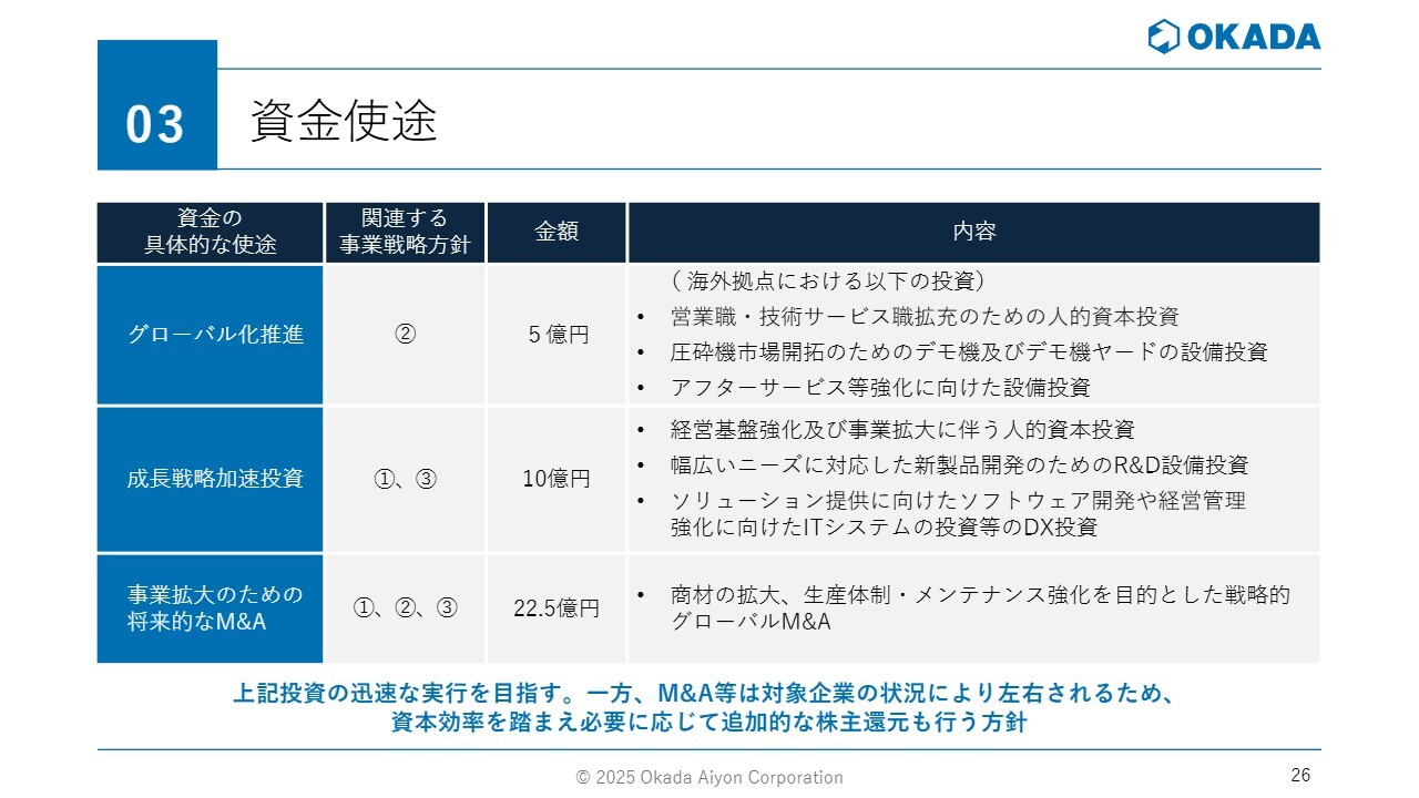 最後に、新株予約権の22億5,000万円については、M&A資金として活用する予定です。これは商材の拡大や生産体制・メンテナンス強化を目的とした戦略的なM&Aであり、国内外問わず検討を進めていく方針です。