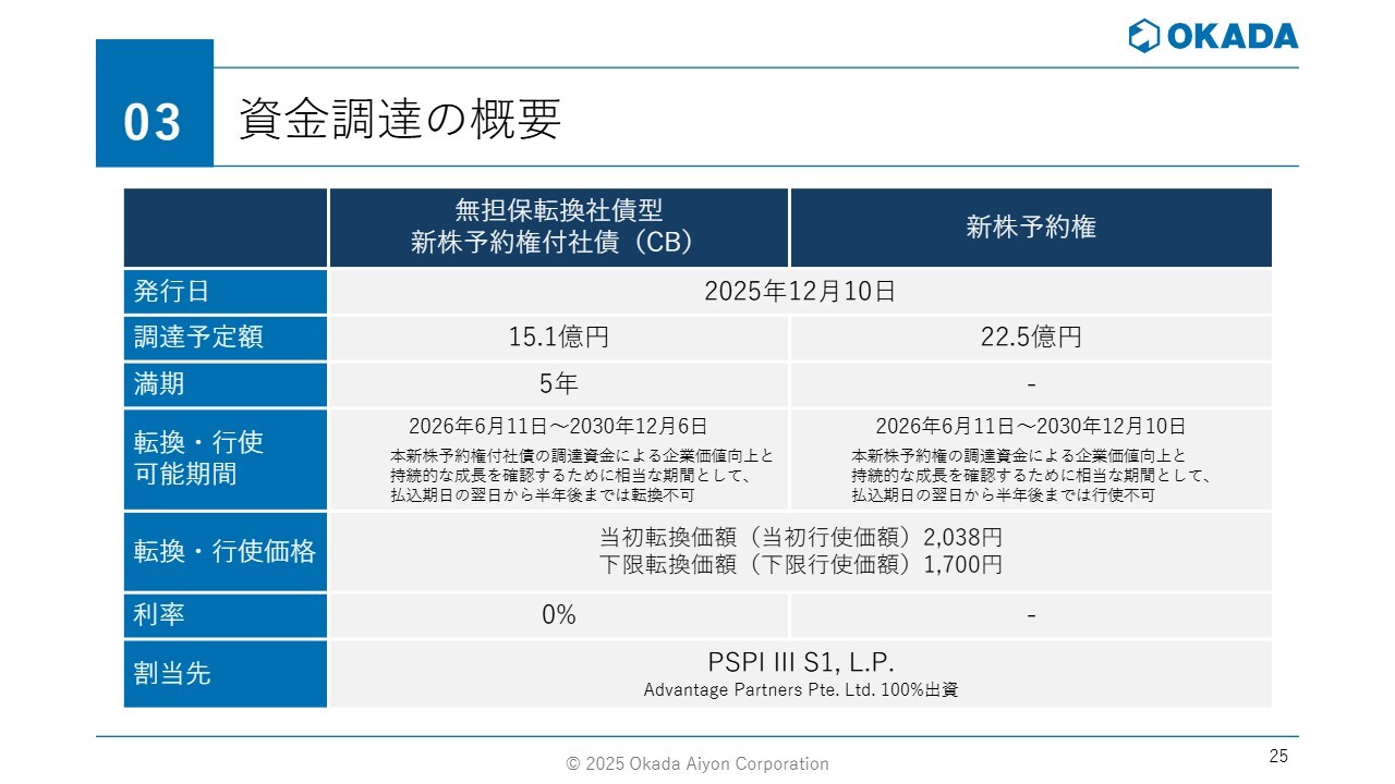 スライドに記載のとおり、AP社が運用するファンドに対し、新株予約権および無担保転換社債型新株予約権付社債を割り当てる予定です。同時に事業提携を開始し、2025年12月10日よりスタートする予定です。
