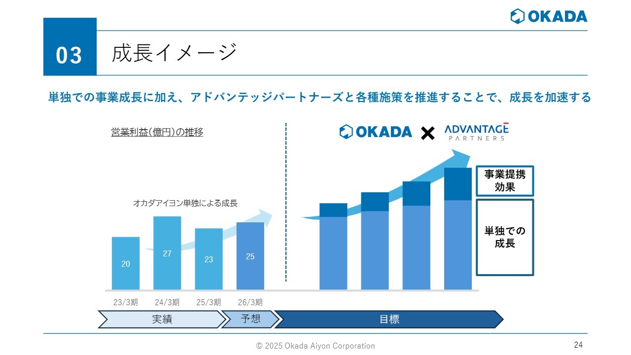 スライドのグラフが示しているように、これまでオカダアイヨン単独で事業の成長を掲げてきましたが、今回はさらに、これまで手が届かなかった分野にも目を向けて戦略を実行していく方針です。