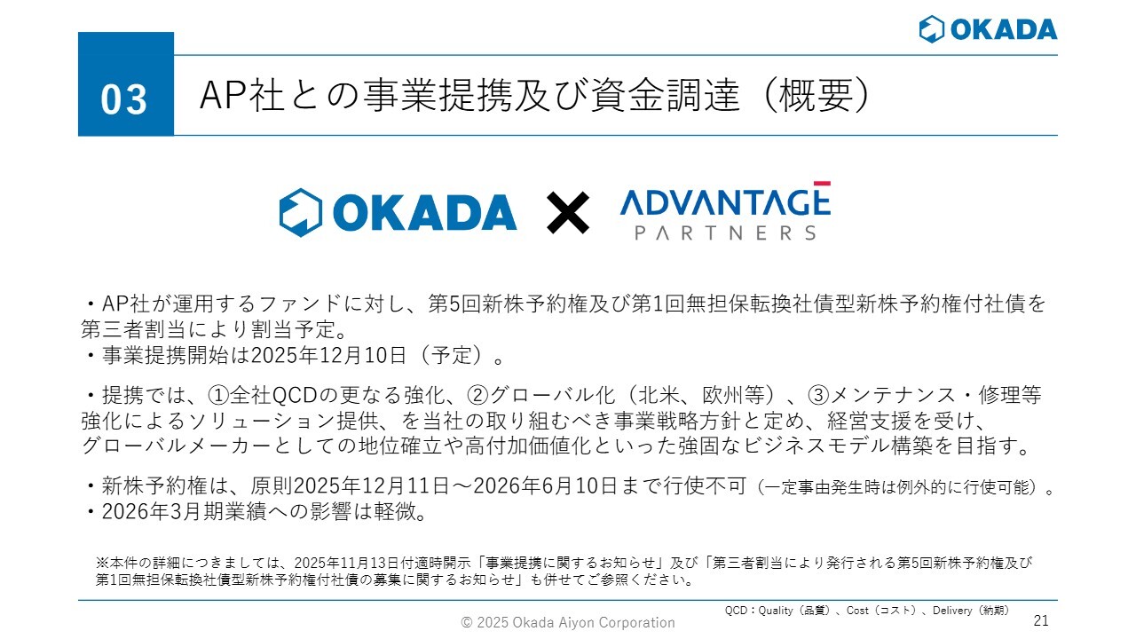 【QAあり】オカダアイヨン、AP社との事業提携および資金調達を実施 グローバルメーカーとしての地位確立や高付加価値化を図る