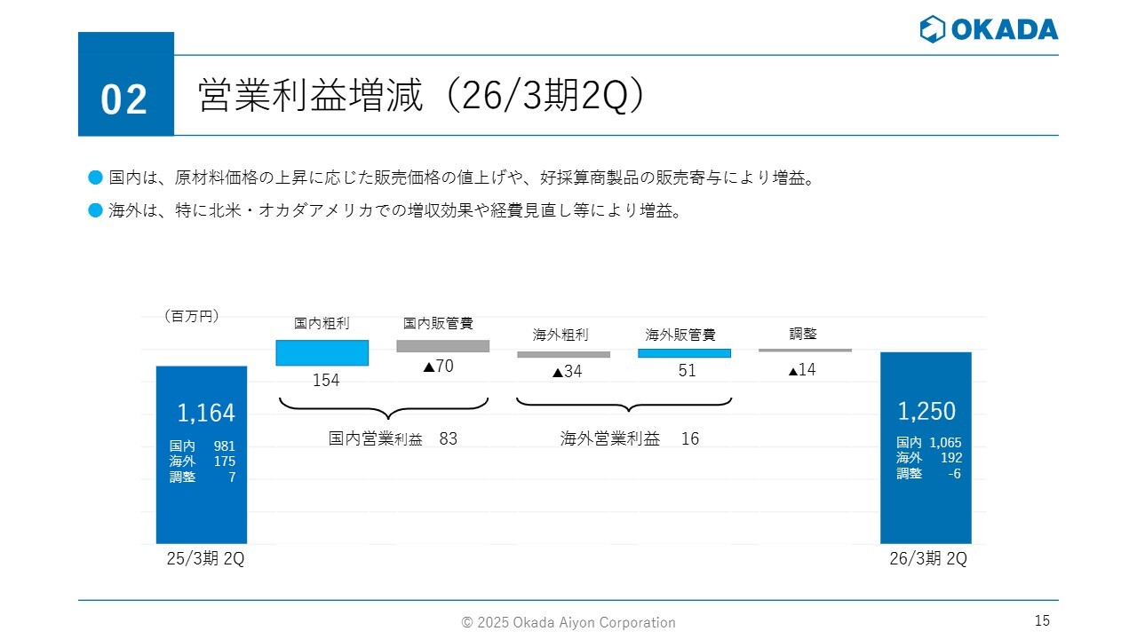 営業利益の増減要因についてです。国内セグメントでは、原材料価格の上昇に伴う販売価格の値上げや、好採算商製品の販売寄与により増益となりました。