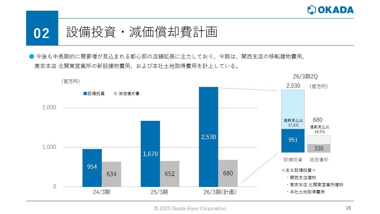 設備投資と減価償却費の計画についてです。設備投資では、今後も中長期的に需要増が見込まれる都心部での店舗拡張に注力しています。今期は、関西支店の移転に伴う建物費用、東京本店および北関東営業所の新設建物費用、さらに借地であった本社土地の取得費用を新たに計上しています。