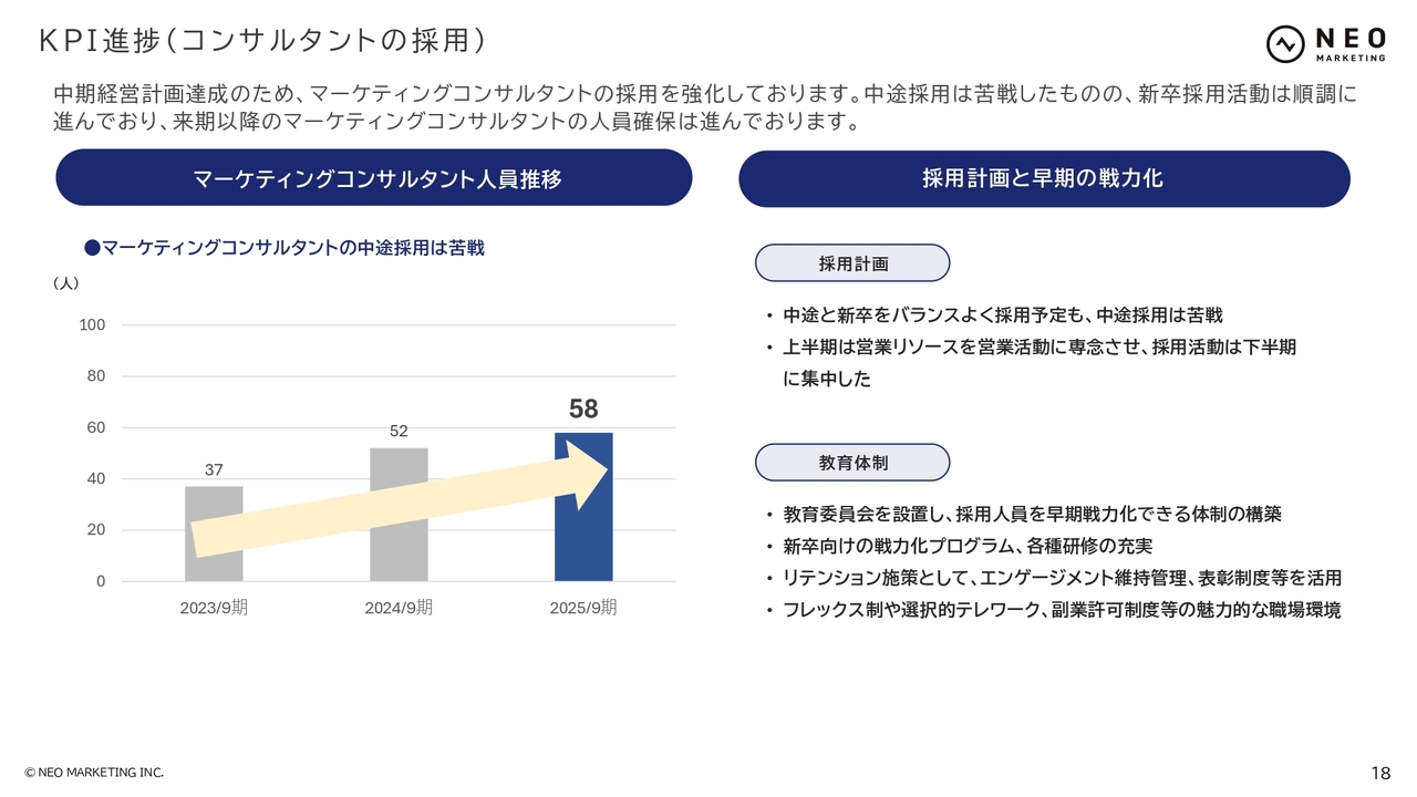 主要なKPIの進捗についてご説明します。まず、コンサルタントは前期比で6名増加し、58名の体制となりました。中途採用は環境が変化しており非常に難しい状況が続いていますが、新卒採用については順調に人材獲得が進んでいます。