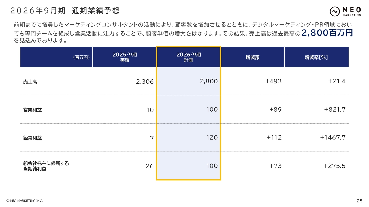 2026年9月期の通期業績予想について、売上高は28億円、営業利益は1億円を計画しています。引き続き先行投資期間と位置づけ、中長期的な成長を目指した基盤強化を優先していきます。サービス内容としては、デジタルマーケティングとPRの領域を新たな成長ドライバーと位置づけ、事業拡大を目指しています。