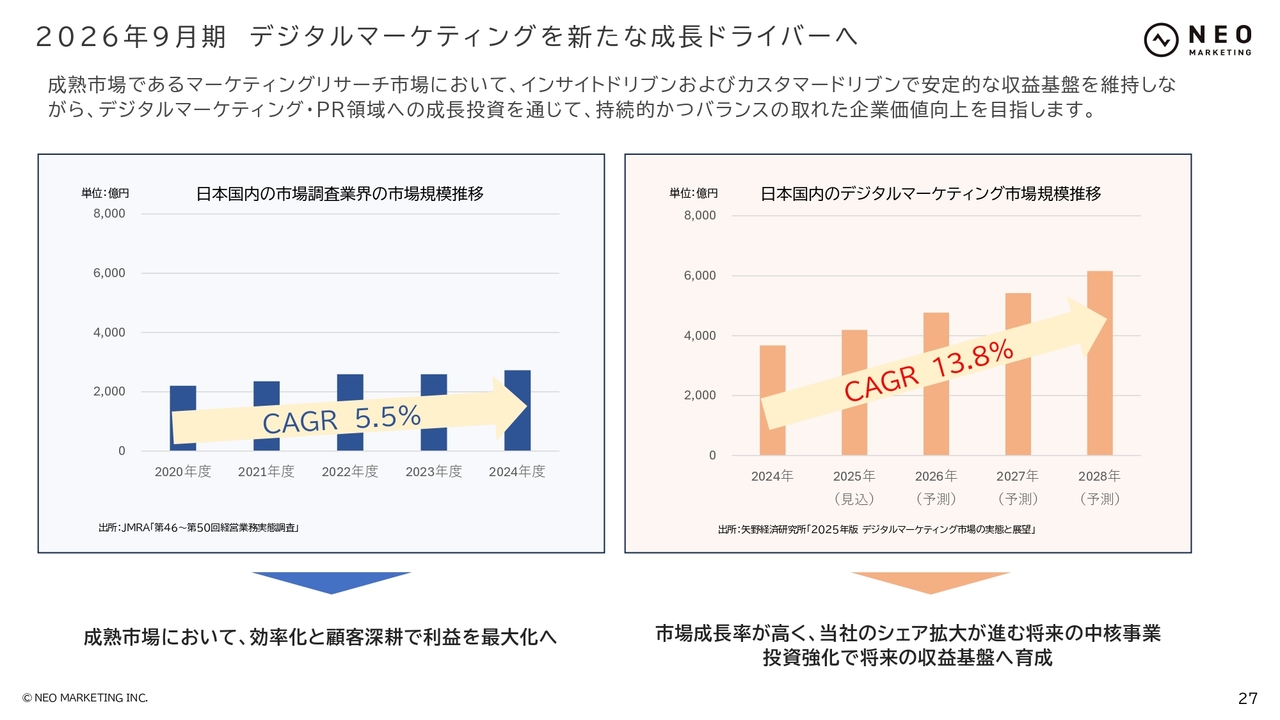 スライド左に記載されている市場調査業界の成長率は、年平均5.5パーセントで推移しています。一方で、右に示したデジタルマーケティング市場は年平均13.8パーセントと、非常に高い成長が見込まれています。