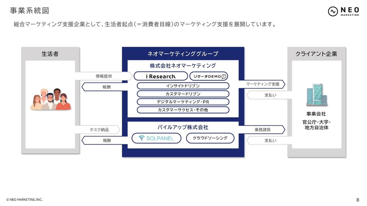基本的なビジネスモデルについてご説明します。生活者から得られた情報を基に、クライアント企業のマーケティングを支援していく流れになっています。また、お客さまからいただいた売上の一部を謝礼として生活者の方に還元するという、循環型のビジネスモデルを作っています。