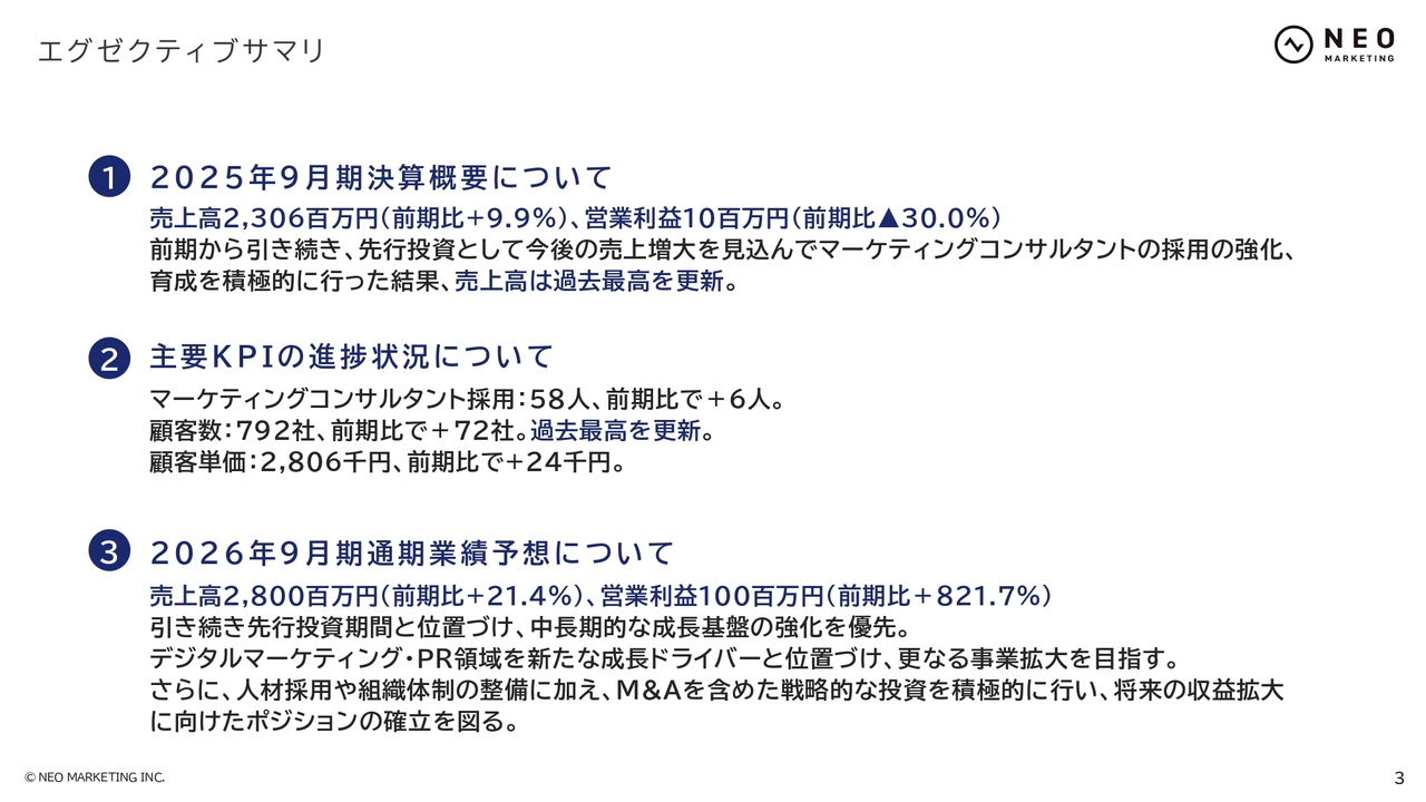 エグゼクティブサマリです。2025年9月期の決算概要をお伝えします。売上高は23億600万円で前期比9.9パーセントの増加、営業利益は1,000万円で前期比30パーセント減少しています。先期に続き先行投資の期間とし、今後の売上増大を見据え、マーケティングコンサルタントの採用強化を進めています。育成を継続的に行った結果、売上高は過去最高を記録しました。