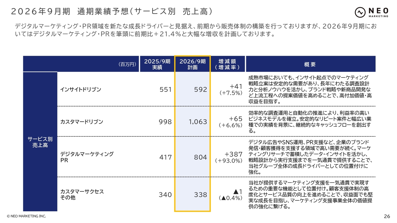 2026年9月期は、「デジタルマーケティング・PR」領域を新たな成長ドライバーに位置づけています。