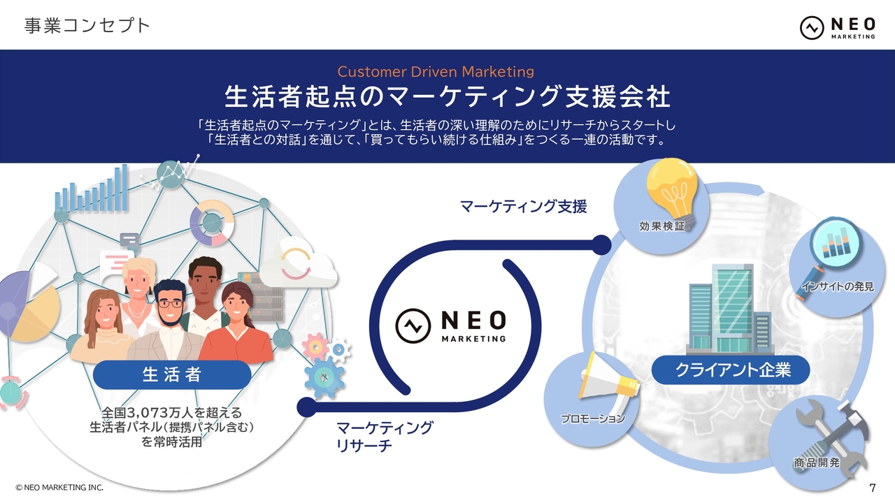事業コンセプトは、「生活者起点のマーケティング支援会社」と掲げています。当社は現在、3,000万人を超える生活者の方々から得られる情報を基に、クライアント企業に対してマーケティング支援を行っています。