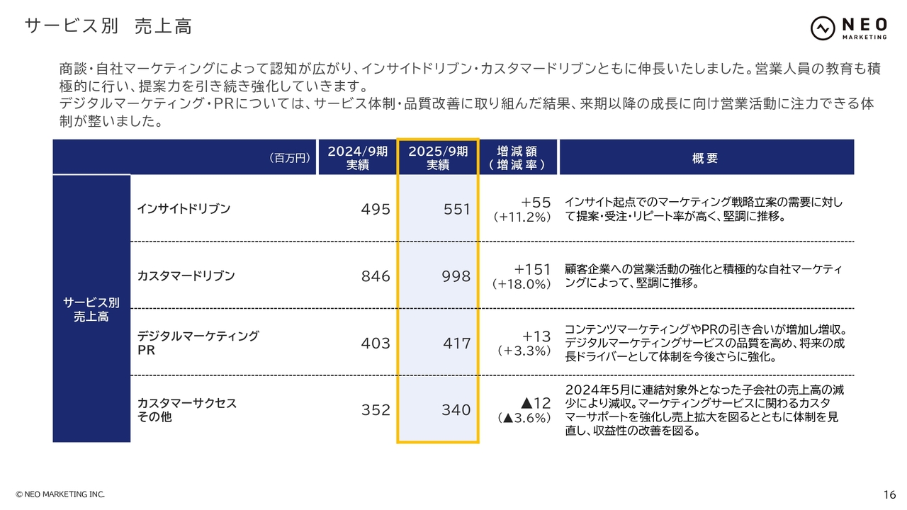 売上高をサービス別に見ていきます。「インサイトドリブン」「カスタマードリブン」ともに2桁成長を達成しました。