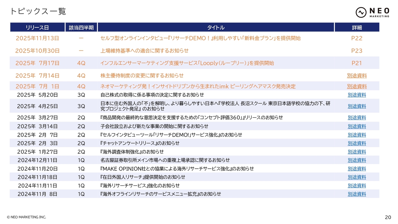 スライドは今期のトピックス一覧です。オレンジ色で示している、足元の第4四半期のトピックスを中心に、次のスライド以降でご紹介します。