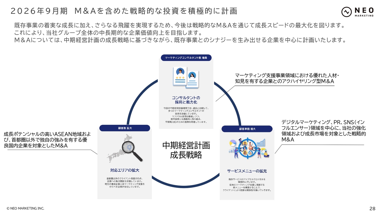 M&Aは中期経営計画の成長戦略に基づき、マーケティング支援の領域で実施する予定です。マーケティングという広範な分野の中でも、私たちが展開している既存事業とのシナジーをしっかりと生み出せる企業や、クライアントに提供できる価値を増やせる企業を中心に実行していこうと考えています。