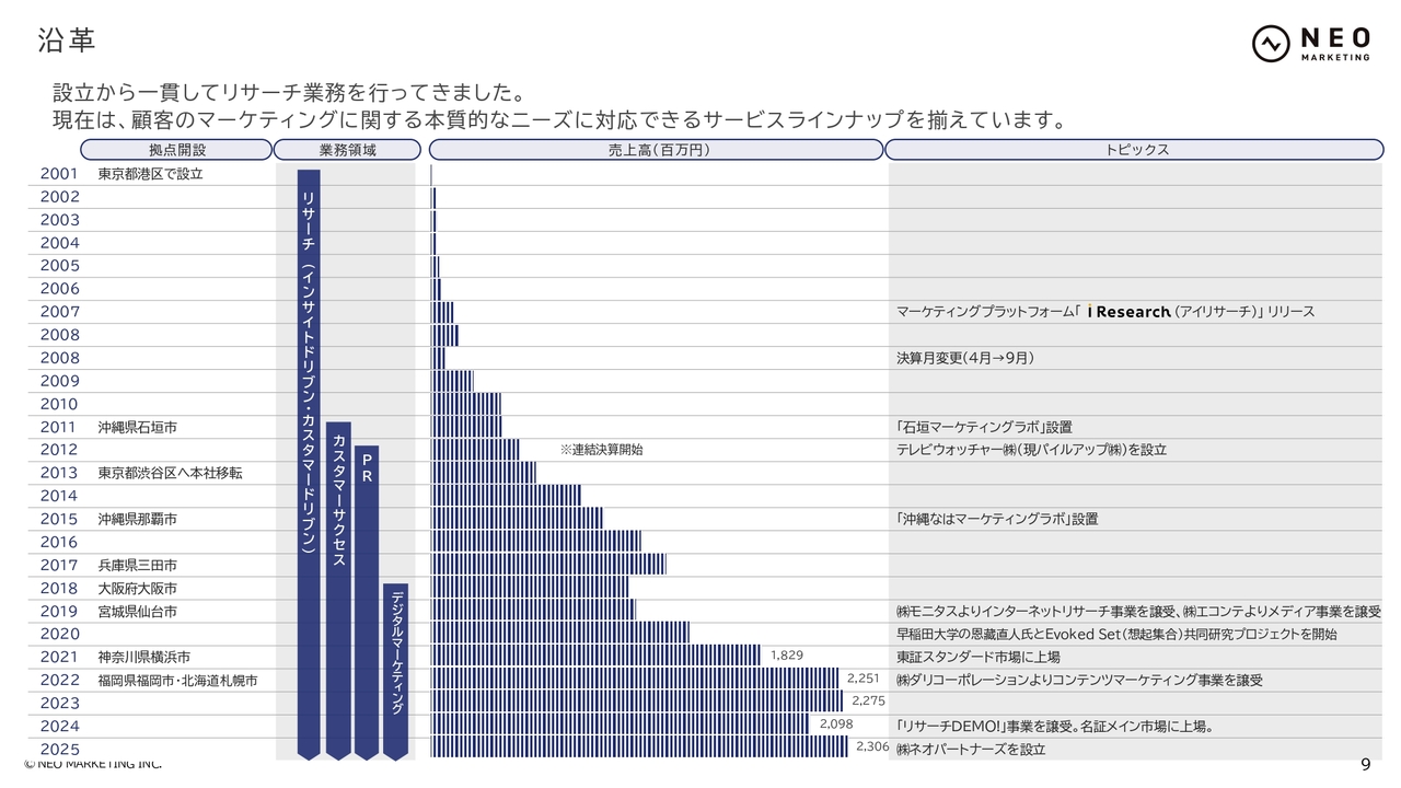 沿革です。スライドの左から拠点の変遷、業務領域、売上高、トピックスを記載しています。創業時はリサーチ事業を起点とし、マーケティング施策の実行に関する事業を強化しながら売上高を伸ばしてきました。