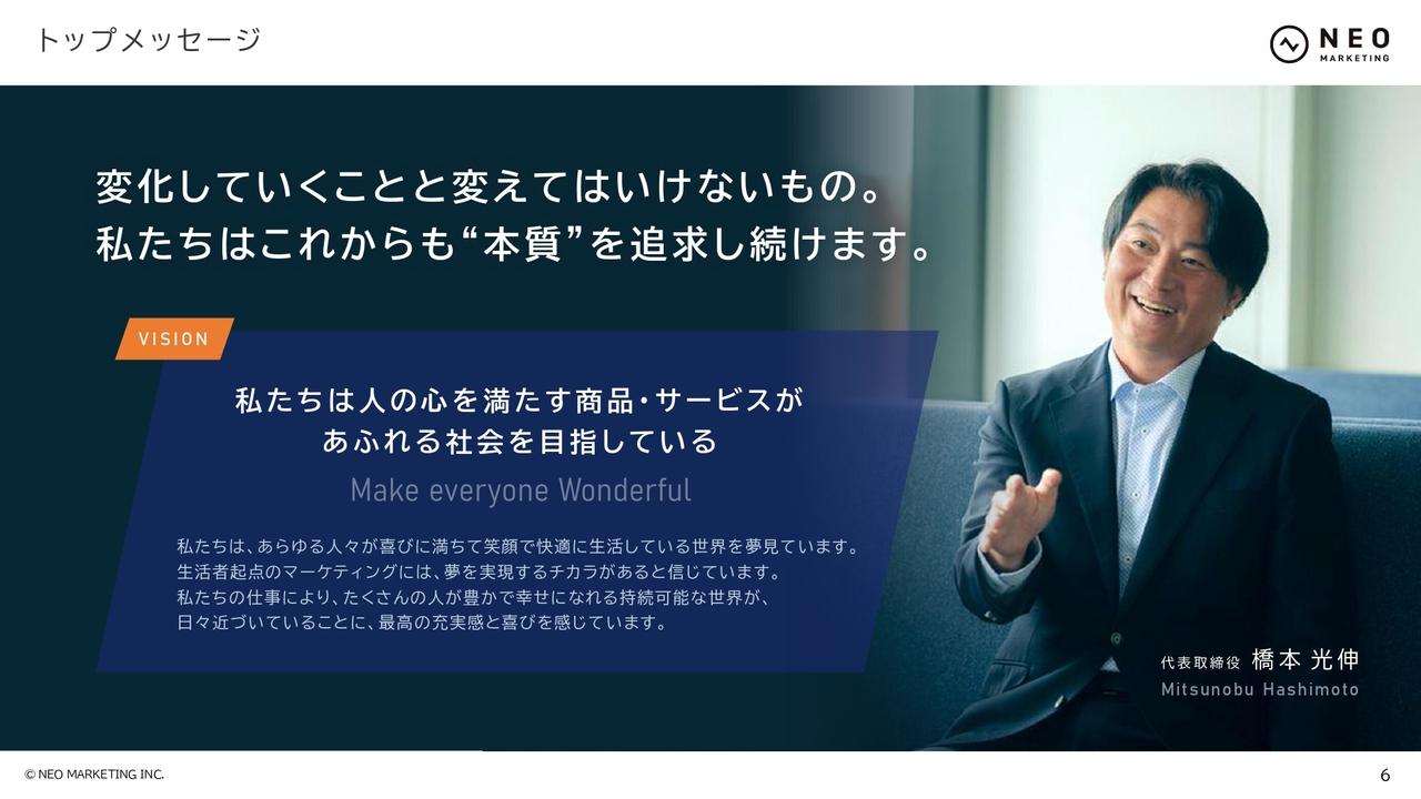 橋本光伸氏(以下、橋本):代表取締役の橋本光伸です。本日は、株式会社ネオマーケティング2025年9月期の決算説明会にご参加いただき、誠にありがとうございます。よろしくお願いします。