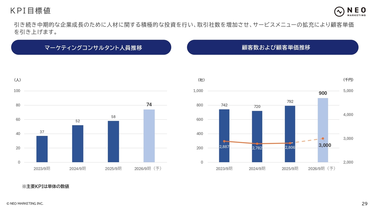 各KPIの数値です。マーケティングコンサルタントは74名、顧客数は900社、顧客単価は1社当たり300万円と、それぞれ前期比で増加を目指します。
