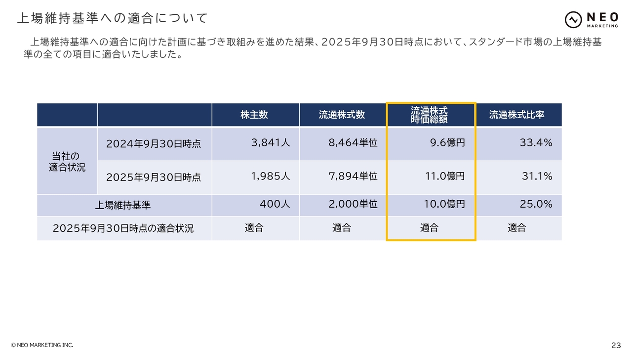 上場維持基準への適合についてです。4項目のうち、流通株式時価総額について、東証スタンダード市場の基準を満たしていなかった時期がありましたが、2025年9月30日時点で基準を満たし、適合している状況です。引き続き企業価値の向上に努めていきます。