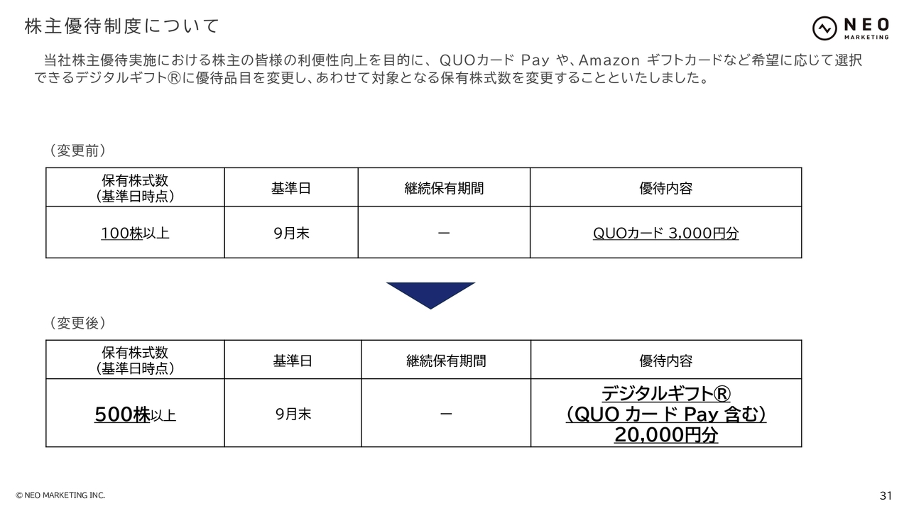 株主還元についてご説明します。株主優待制度は、株主の方々の利便性向上を目的として、一部を刷新しました。100株以上を保有されている株主さまに提供していたQUOカード3,000円分を、500株以上保有の株主さまにデジタルギフト2万円分へ変更します。