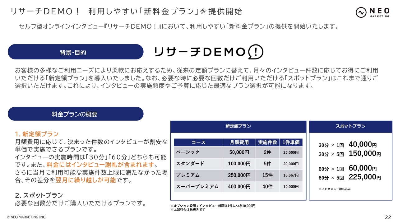 前期にセルフ型オンラインインタビューサービス「リサーチDEMO!」を立ち上げました。直近の取り組みとして、柔軟にご利用いただけるよう新しい料金プランを導入しています。こちらはいわゆるサブスクリプションサービスです。お客さま側で必要なボリュームのサービスを、必要な分だけ月額の定額制で継続して利用していただけるプランです。