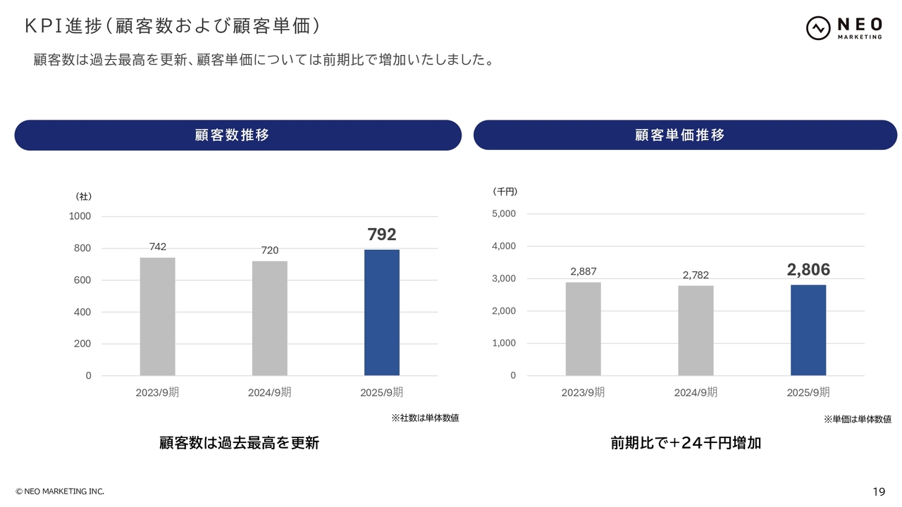 お客さまの数は792社となり、過去最高を更新しました。顧客単価は前期比でわずかに増加し約280万円となっています。