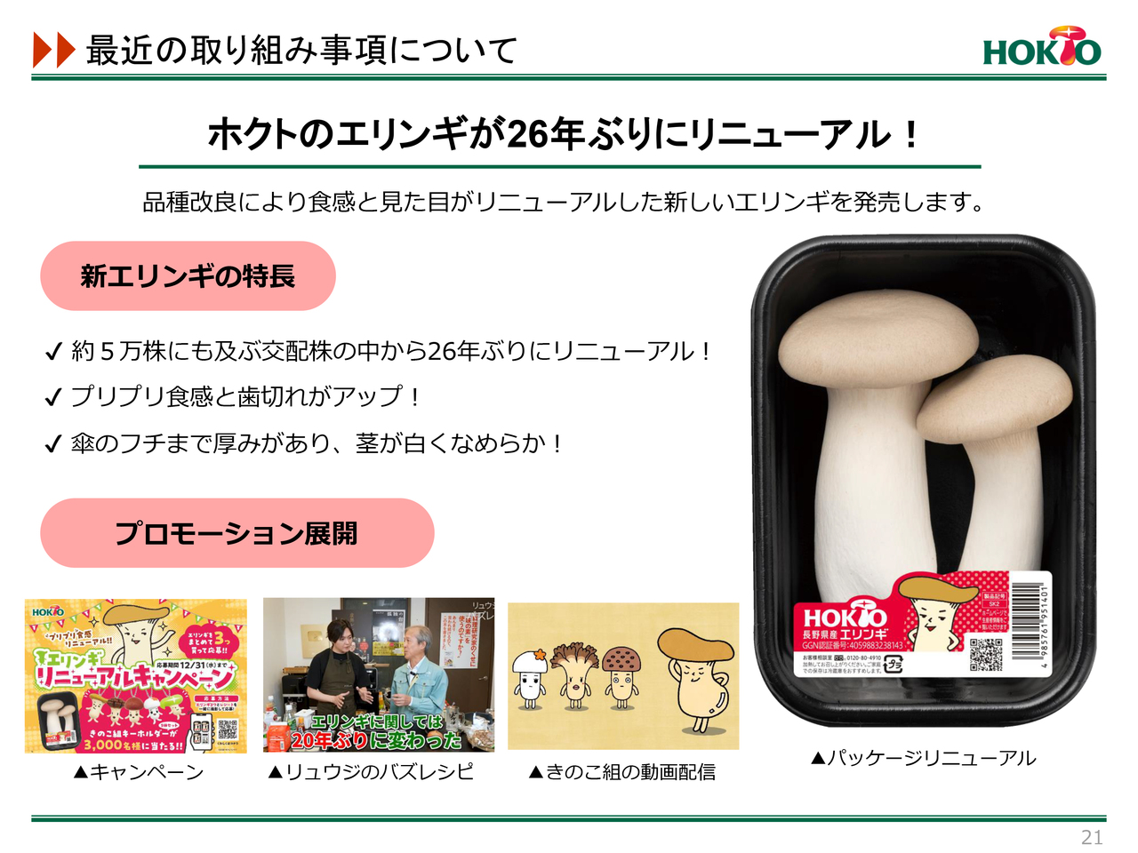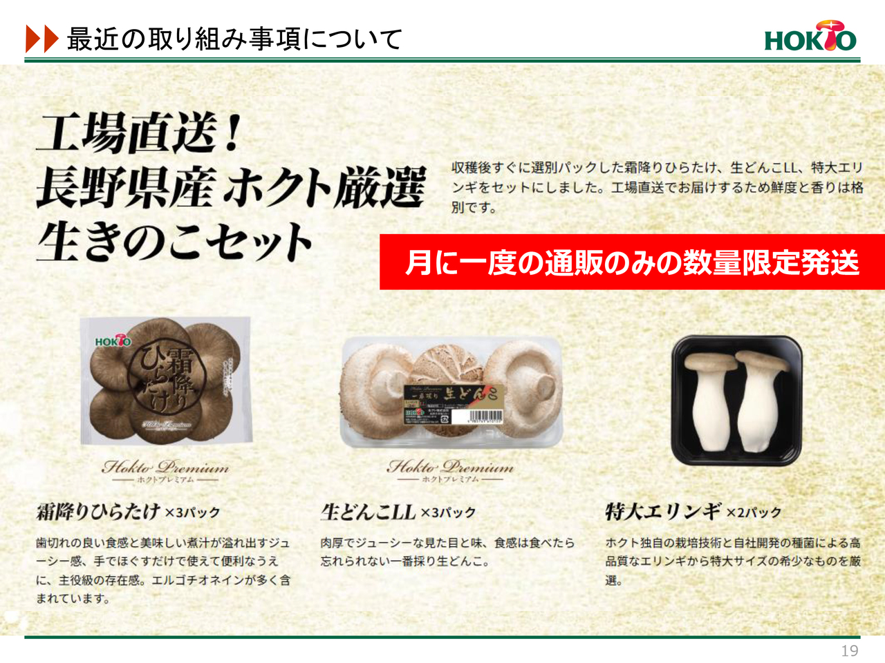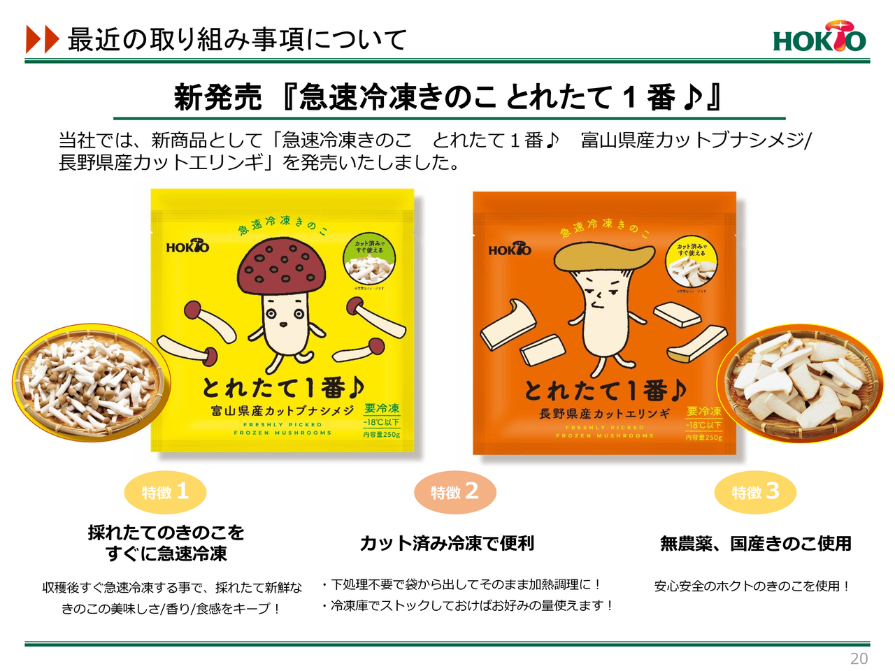 前回の中期経営計画でもお話しした「急速冷凍きのこ とれたて1番♪」についてです。これは富山県産カットブナシメジと長野県産カットエリンギを急速冷凍した商品で、長野県と首都圏の限られた店舗で試験的に販売を開始しました。