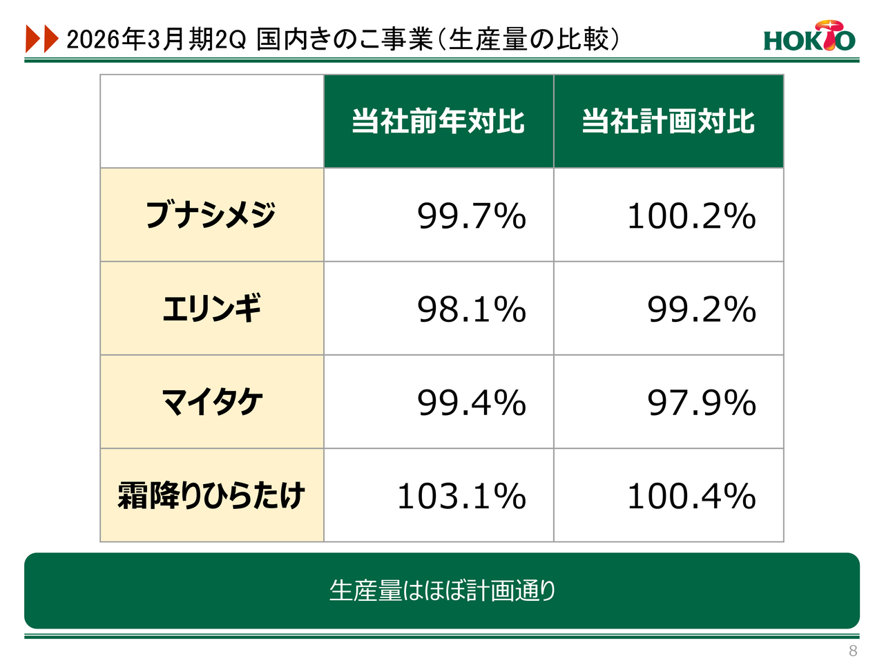 生産量については、マイタケを中心に一部生産を抑えたことで価格の安定につながったと考えています。また、「霜降りひらたけ」に関しては、先ほどのSNSでの発信などにより需要が増加し、前年に比べて生産量を伸ばすことができました。そのほかについてはほぼ計画どおりで、前年と同程度の状況です。