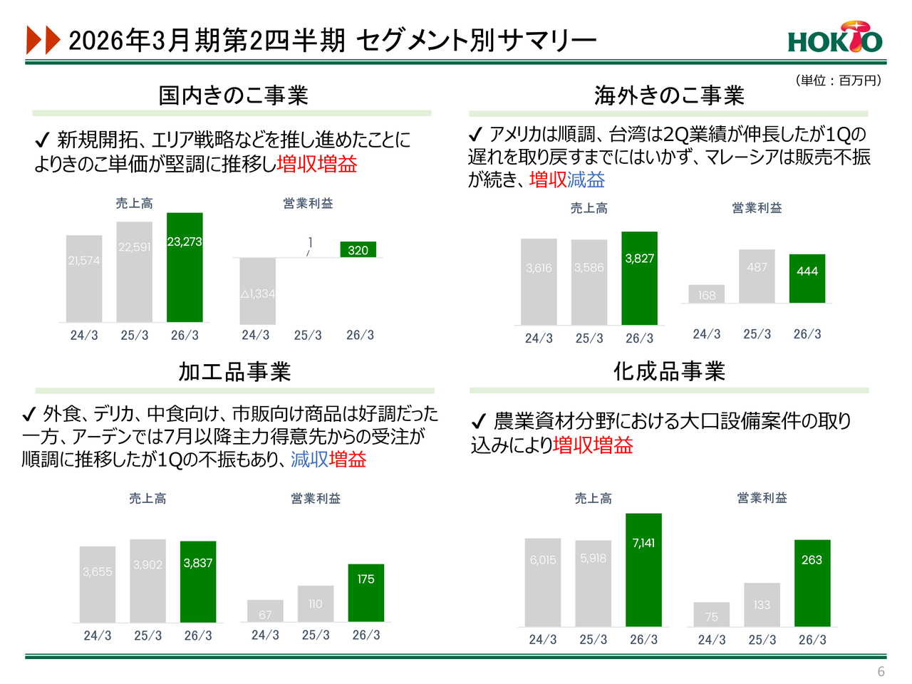 セグメント別のサマリーです。国内きのこ事業は、新規開拓やエリア戦略を推進した結果、きのこ単価が堅調に推移し、増収増益となっています。