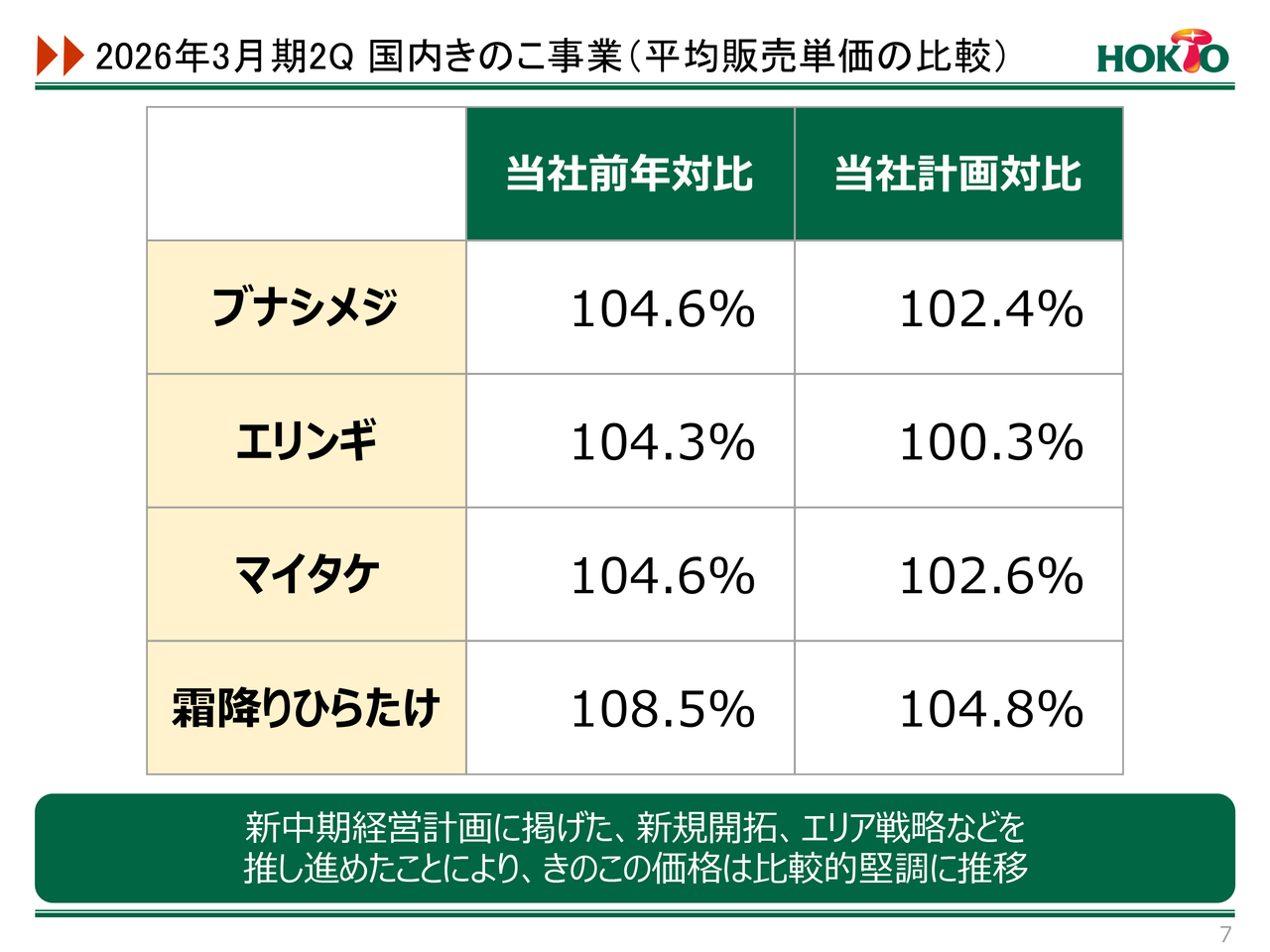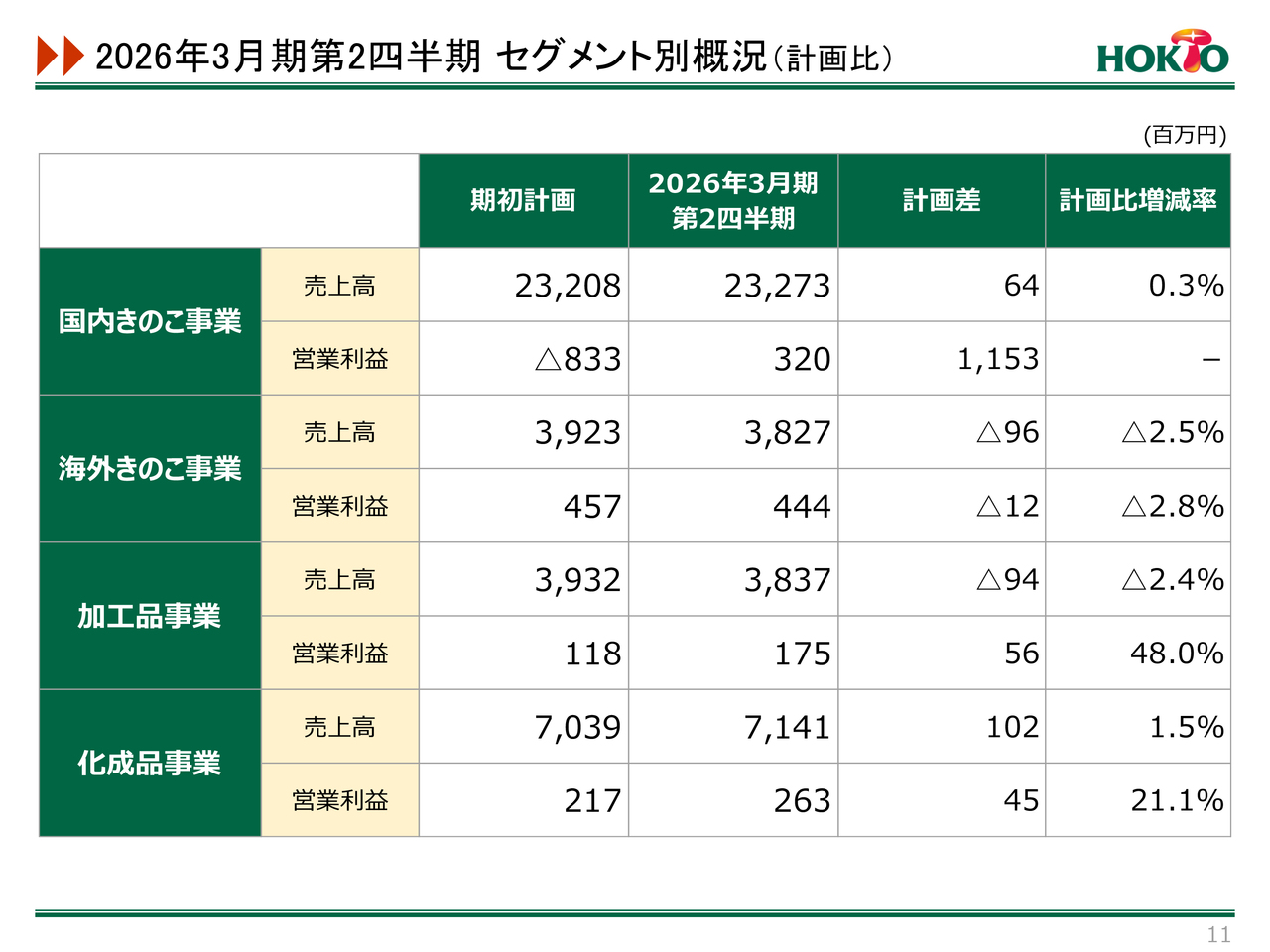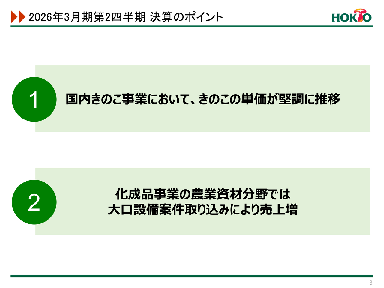 1点目は国内きのこ事業において、第2四半期まできのこの販売単価が堅調に推移し、売上と利益の増加につながったことです。2点目は化成品事業の農業資材分野で大口設備案件を取り込むことで売上が伸びたことです。この2つが大きなポイントであったと思います。