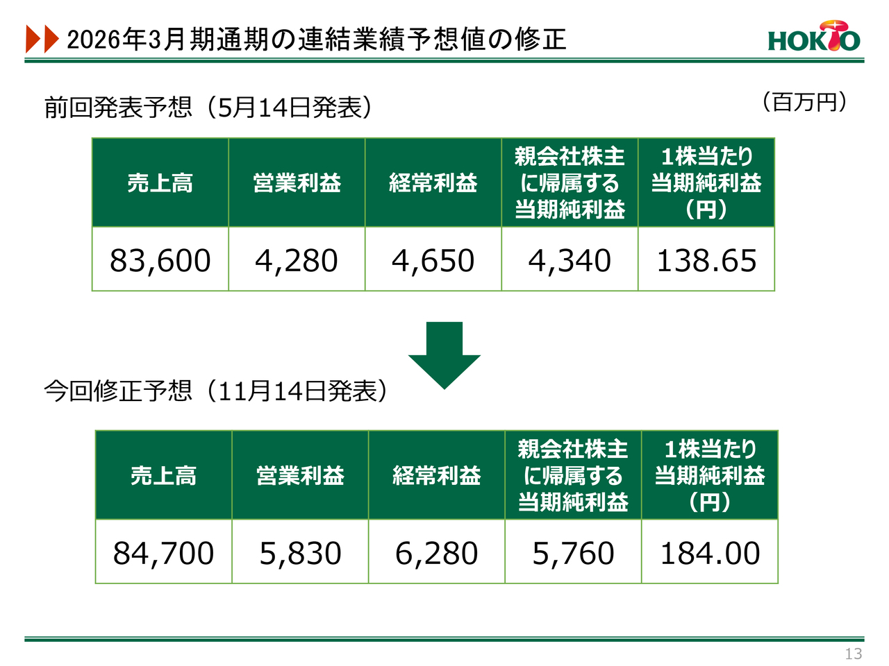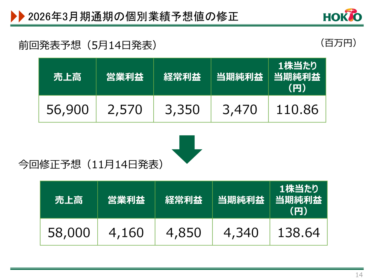 2026年3月期通期見通しの修正についてです。11月14日に決算発表と合わせて、上方修正を発表しました。