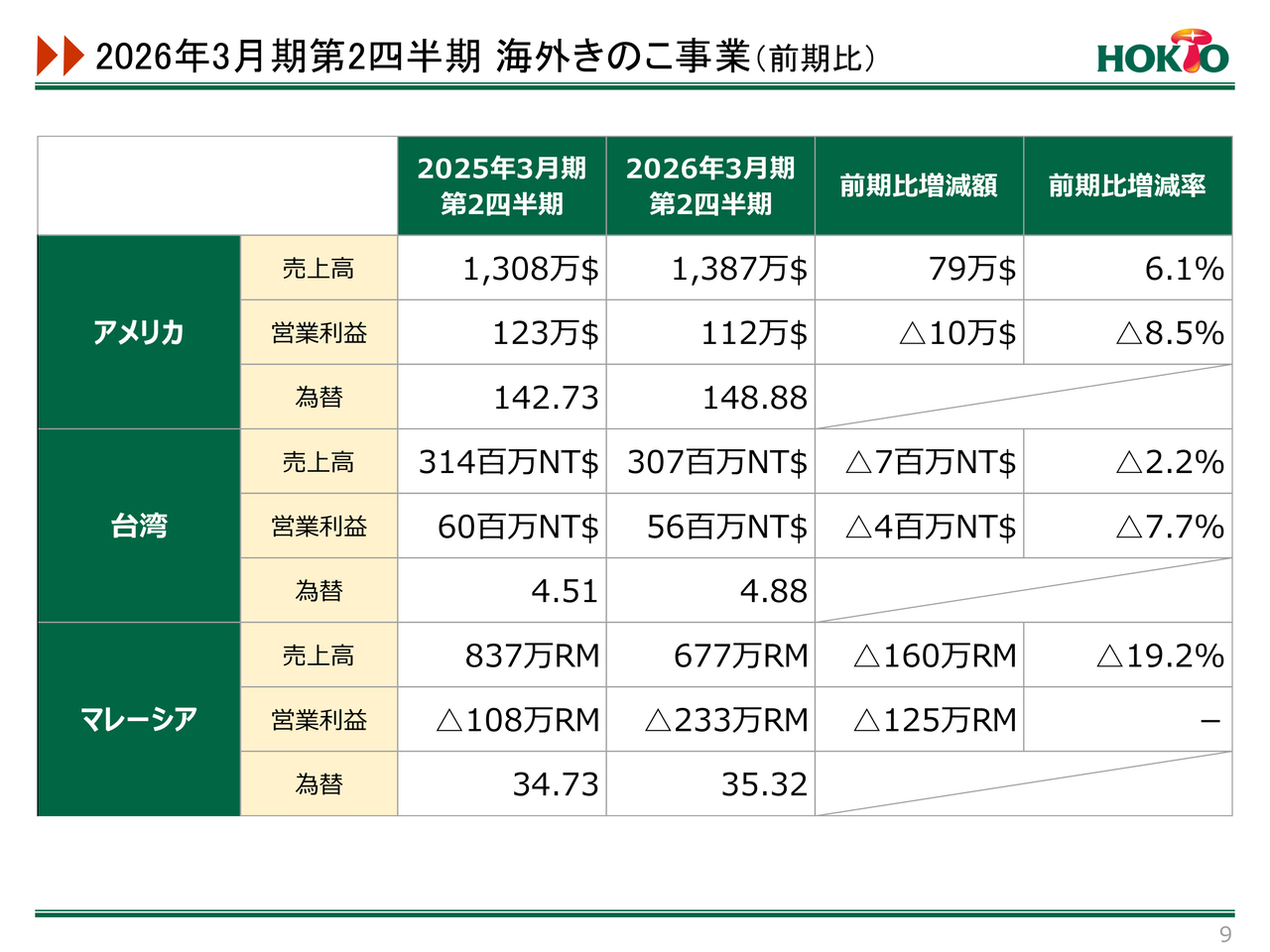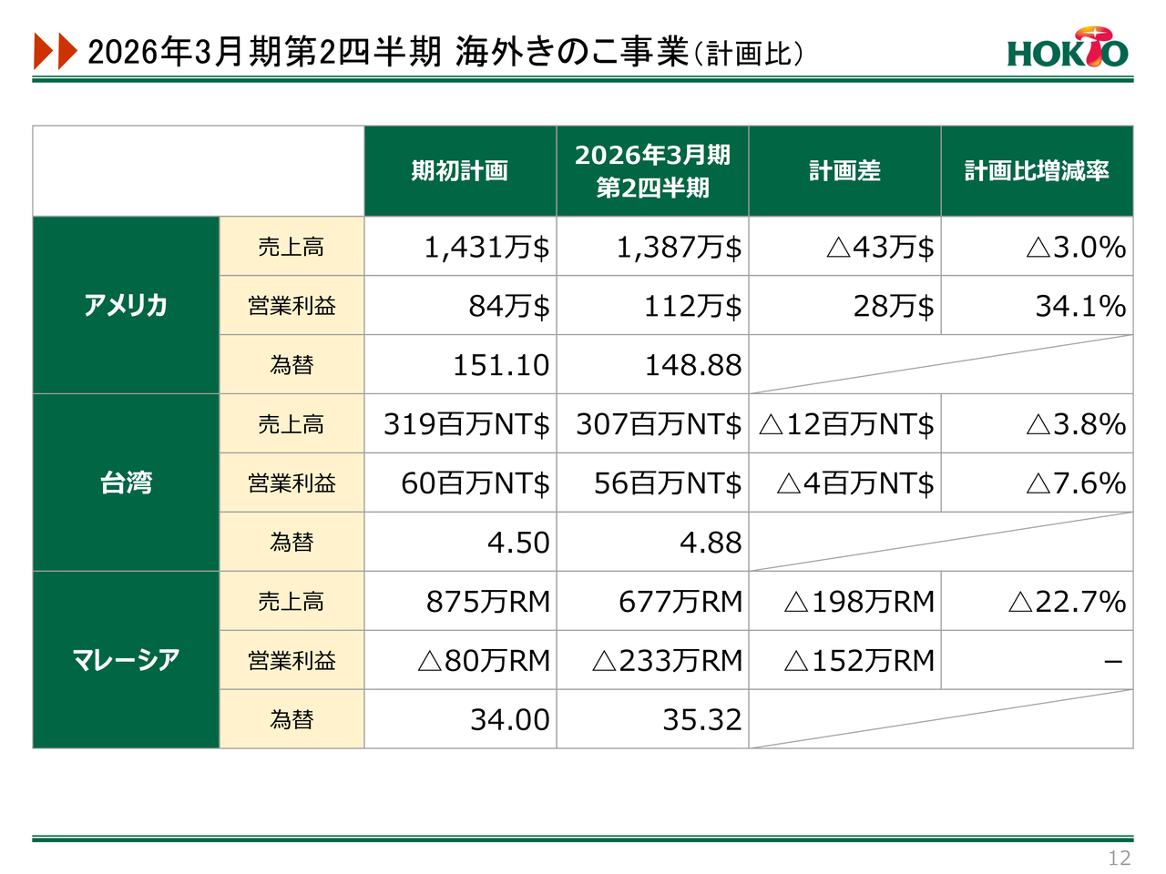 海外きのこ事業では、アメリカは引き続き順調でしたが、台湾は第1四半期に環境が整わず、苦労しました。第2四半期で遅れを取り戻しましたが、計画には届きませんでした。