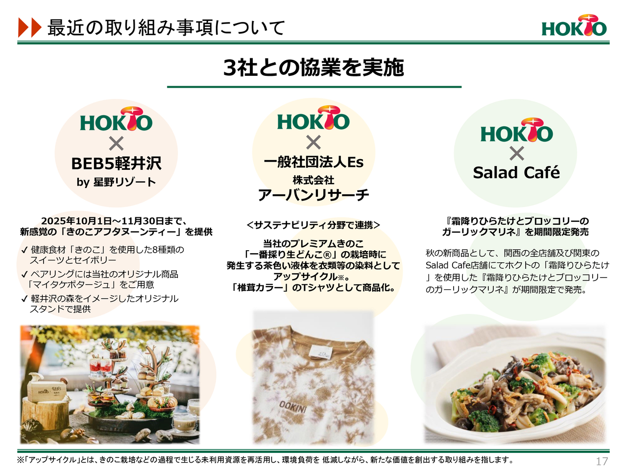 最近の取り組み事項についてご報告します。スライドに記載のとおり、さまざまな会社とコラボレーションを行い、共同事業を進めています。すでにいくつかのリリースを実施していますが、株式会社星野リゾートや株式会社アーバンリサーチなどとともに、マーケティングを含むさまざまな分野で取り組みを進めています。