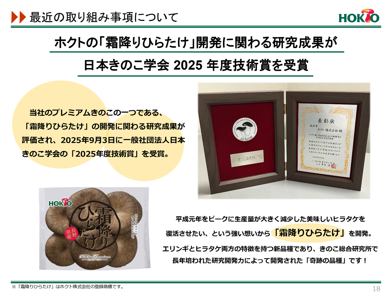 当社の「霜降りひらたけ」の開発に関わる研究成果が評価され、日本きのこ学会の「2025年度技術賞」を受賞しました。「霜降りひらたけ」は、当社の研究員が長年の努力を重ねて開発したものです。今回の表彰は研究活動の1つの成果であると言えるかと思います。