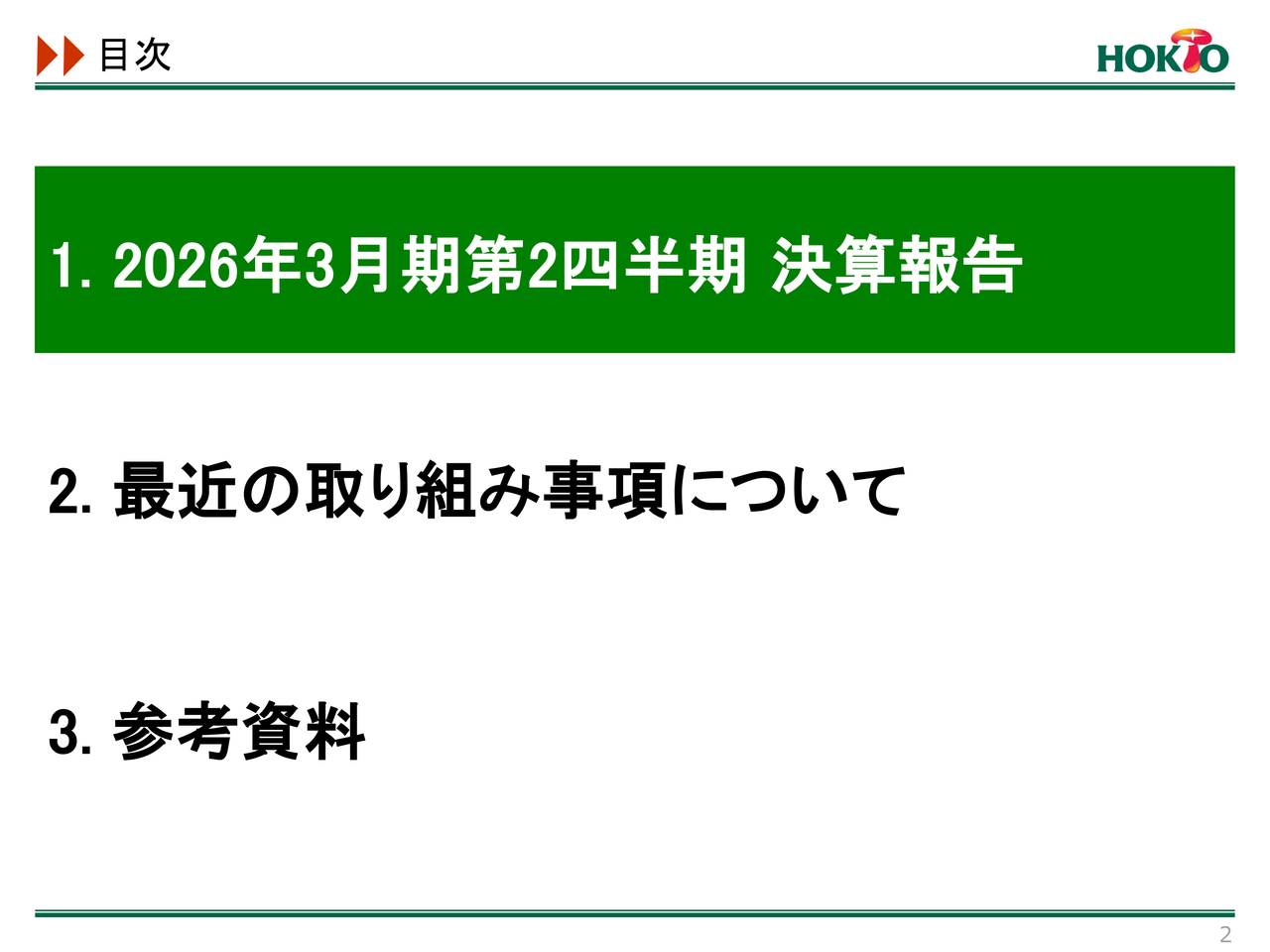 水野雅義氏(以下、水野):ホクト株式会社代表取締役社長の水野です。本日は当社の決算説明会にオンラインでご出席いただき、ありがとうございます。今回は2026年3月期第2四半期の決算報告と最近の取り組み事項についてお話しします。