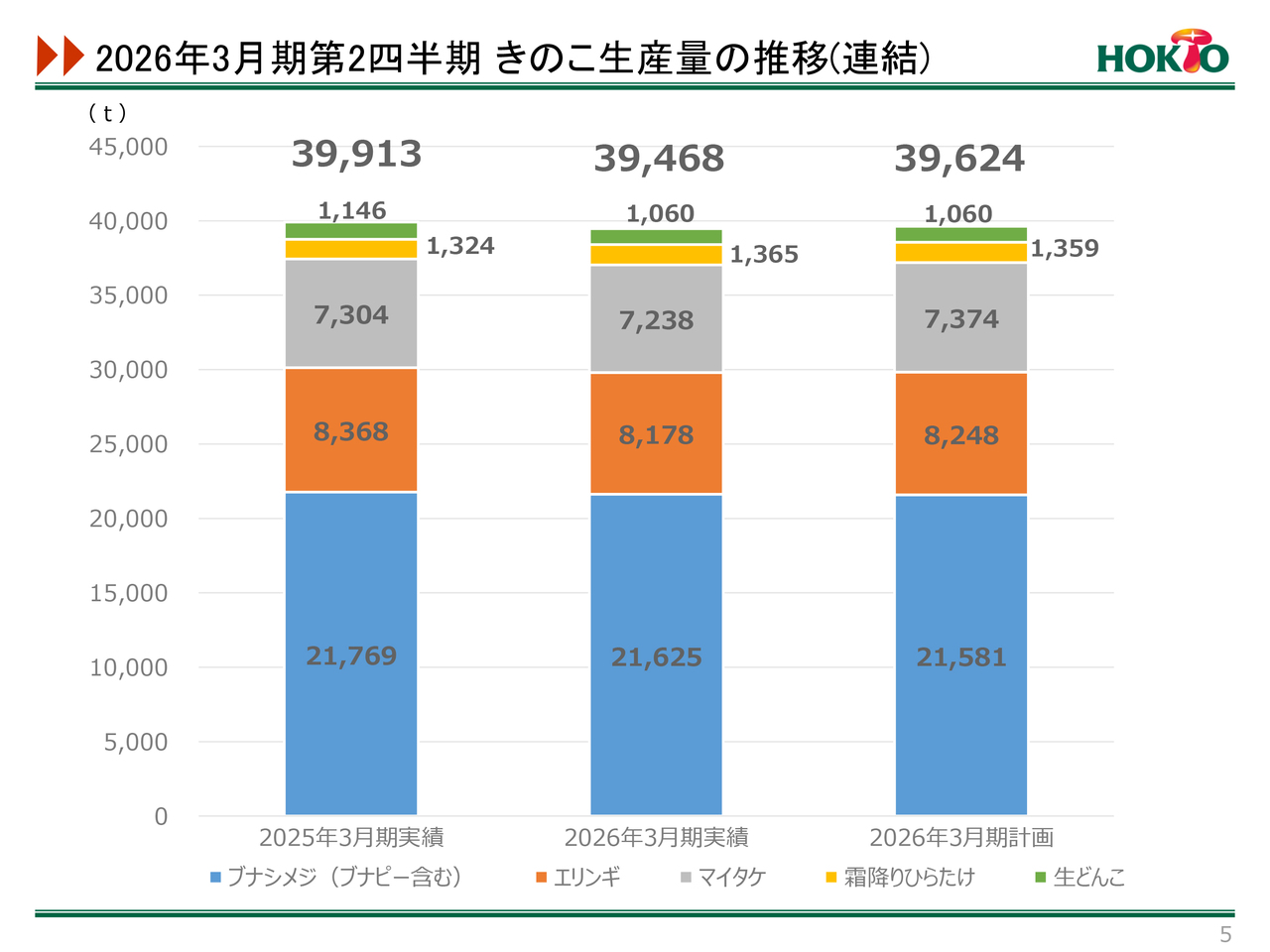 2026年3月期第2四半期 きのこ生産量の推移(連結)