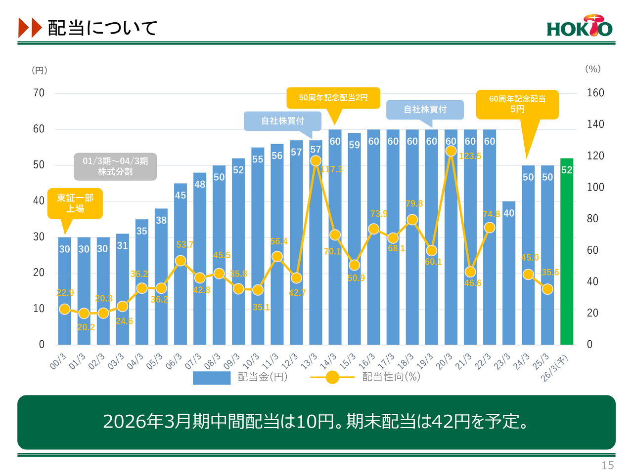 配当についてです。今期の期末配当は未定としていましたが、前期以上の数字を出せる見込みとなりました。そのため、今期は2円増配し、中間配当10円、期末配当42円を予定しています。ただし、状況次第では変更する可能性もありますので、ご了承ください。