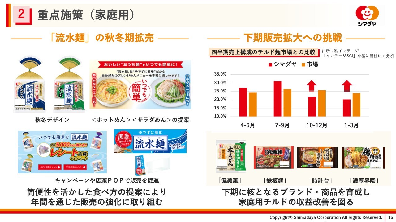 家庭用チルドでは、下期の売上拡大に向け「流水麺」の拡売に取り組んでいきます。サラダめんに加え、あたたかい食べ方としてホットめんの提案を実施し、年間を通した簡便商品として訴求します。